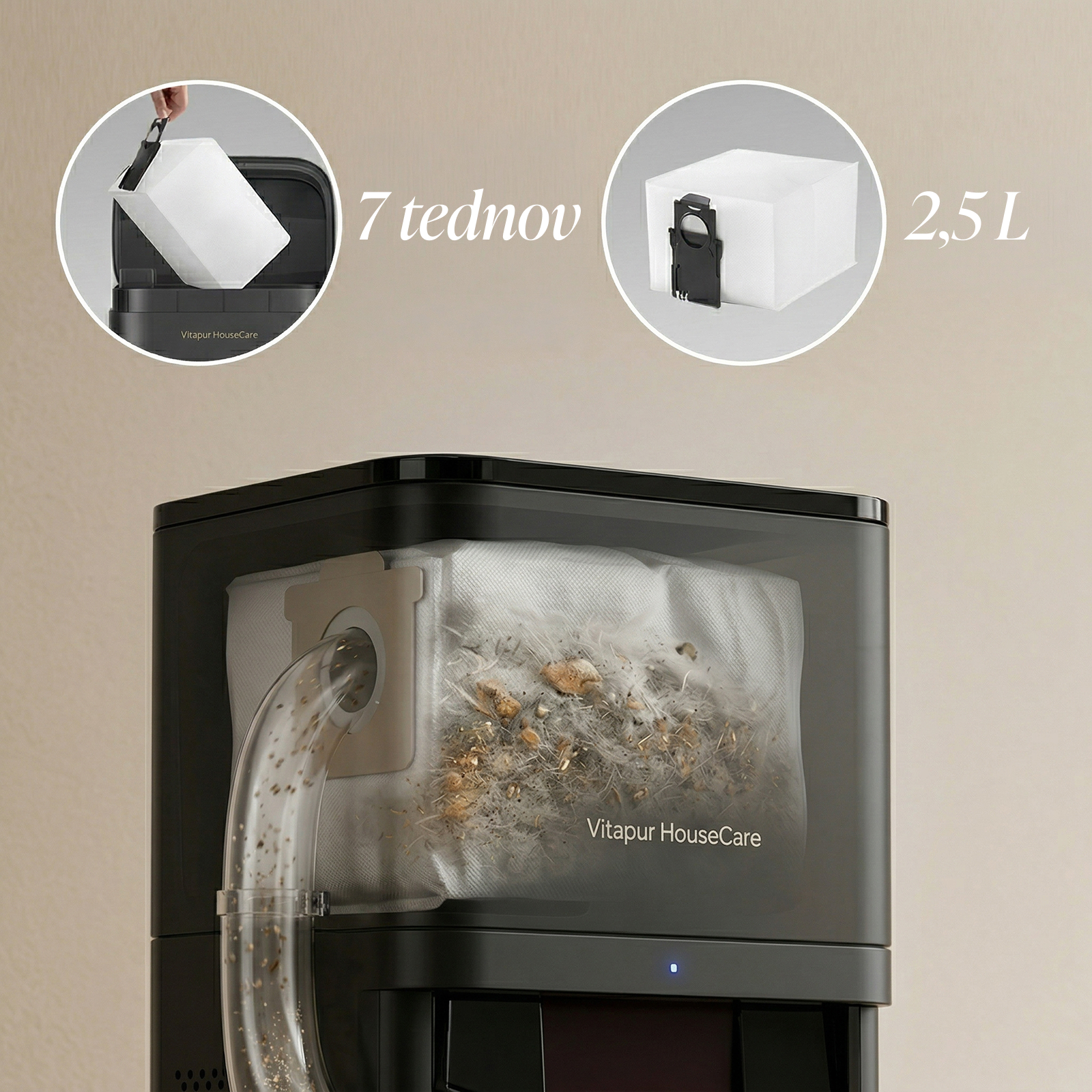 Sami nimate nobenega stika z umazanijo, vrečka v polnilni postaji pa z volumnom 2,5 L omogoča do 7-tedensko delovanje brez vašega posredovanja.