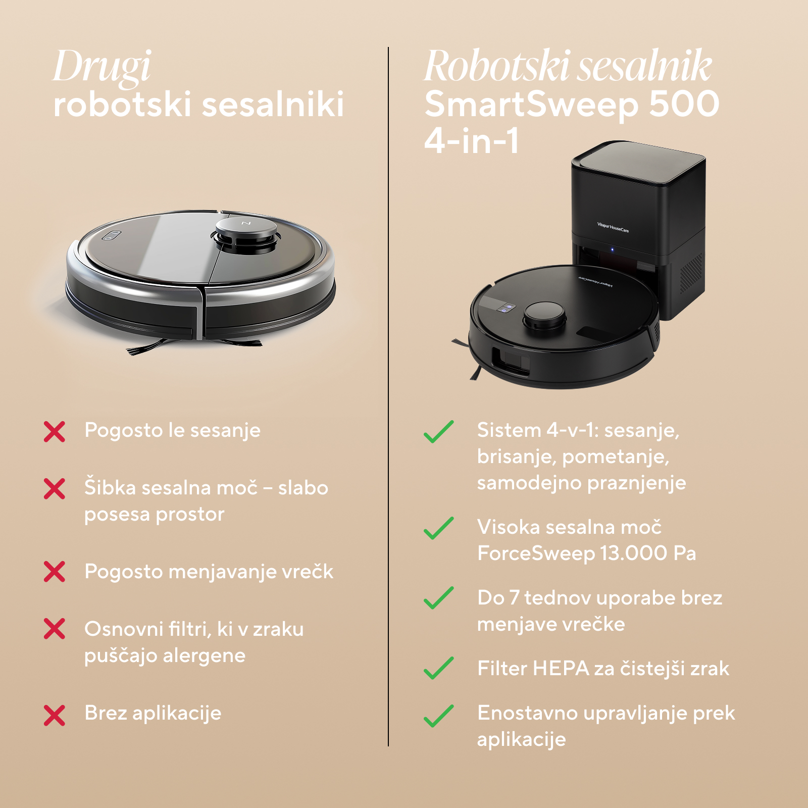 SmartSweep 500 4-in-1 združuje sesanje, mokro brisanje in samodejno praznjenje v enem pametnem sistemu, ki ga upravljate prek aplikacije. Z zmogljivo sesalno močjo ForceSweep in natančno navigacijo NaviSense učinkovito odstrani prah, umazanijo in živalske dlake – vi pa uživate v do 7 tednih brezhibne čistoče brez dodatnega dela.