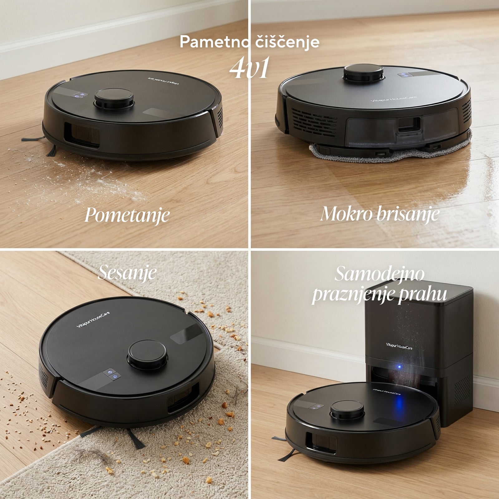 • 4-v-1: sesanje, mokro brisanje, pometanje, samodejno praznjenje prahu