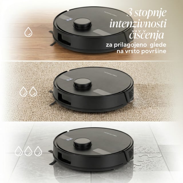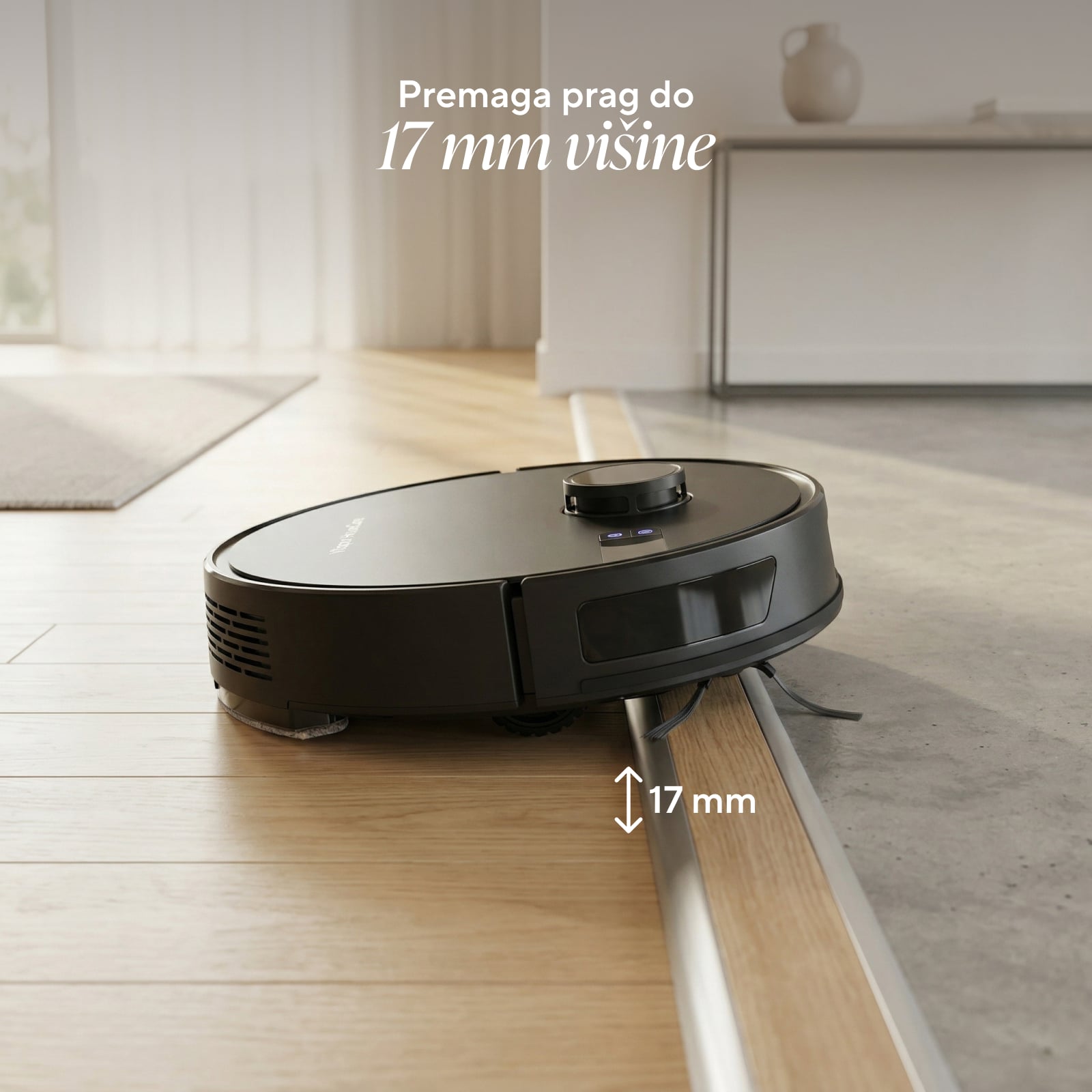 Robotski sesalnik se izkaže na različnih vrstah tal – parketu, vinilu, ploščicah in preprogah z nizkimi vlakni. Z lahkoto se premika iz prostora v prostor, saj lahko premaga pragove do višine 17 mm.