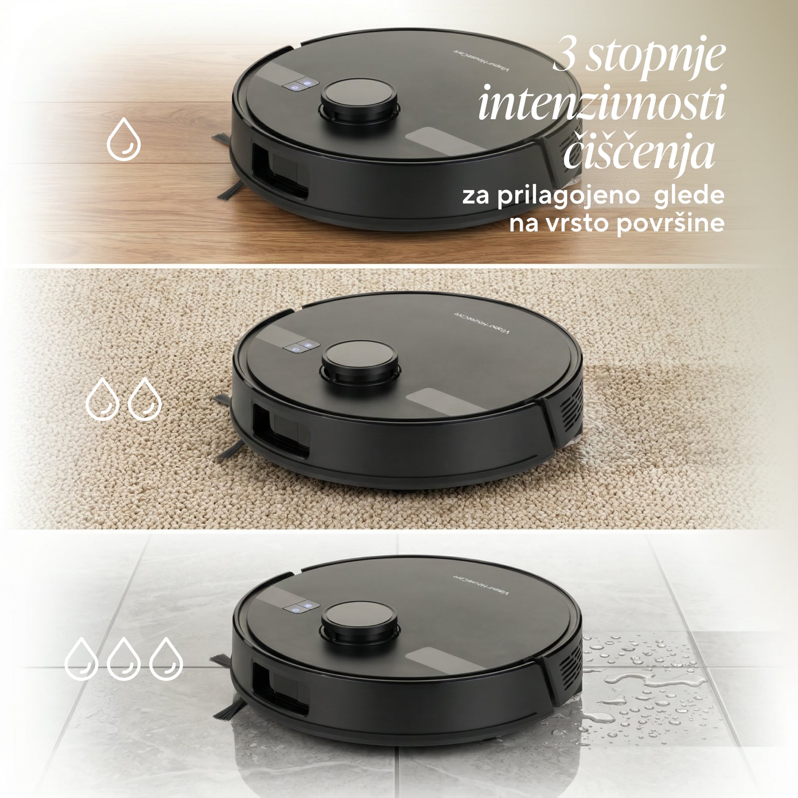 • 3 stopnje pretoka vode za prilagojeno intenzivnost brisanja glede na vrsto tal