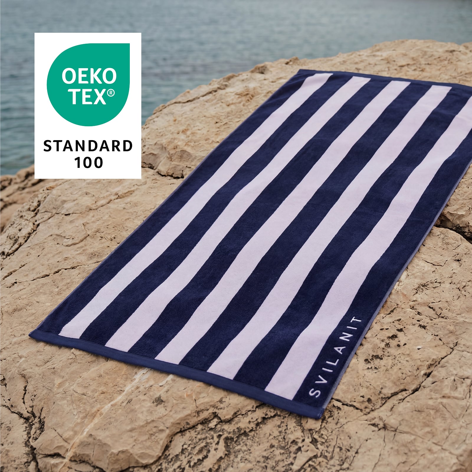 Vse brisače za plažo Svilanit imajo mednarodno priznan certifikat OEKO-TEX® Standard 100, ki potrjuje, da je uporabljeni material brez škodljivih snovi in popolnoma varen za vsakodnevno uporabo.