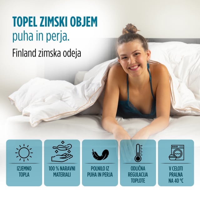 Topla odeja z bogatim volumnom zelo dobro regulira temperaturo tvojega telesa. 100 % naravni materiali iz puha, perja in bombaža te varujejo pred nižjimi temperaturami. Odeja Finland je kot nalašč tudi za vse tiste, ki vas vse leto rado zebe in se ponoči radi pokrijete s toplejšimi materiali.