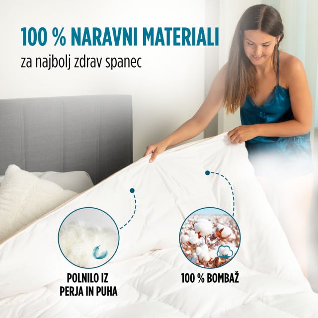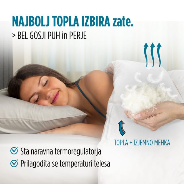 Beli gosji puh in mehko perje poskrbita za najboljšo spalno klimo, ki se prilaga tvojemu telesu in temperaturi, v kateri spiš. Lažje dihanje, manj nočnega potenja in popolna sprostitev telesa so le nekatere prednosti, ki te prepričajo v vsaki noči.
