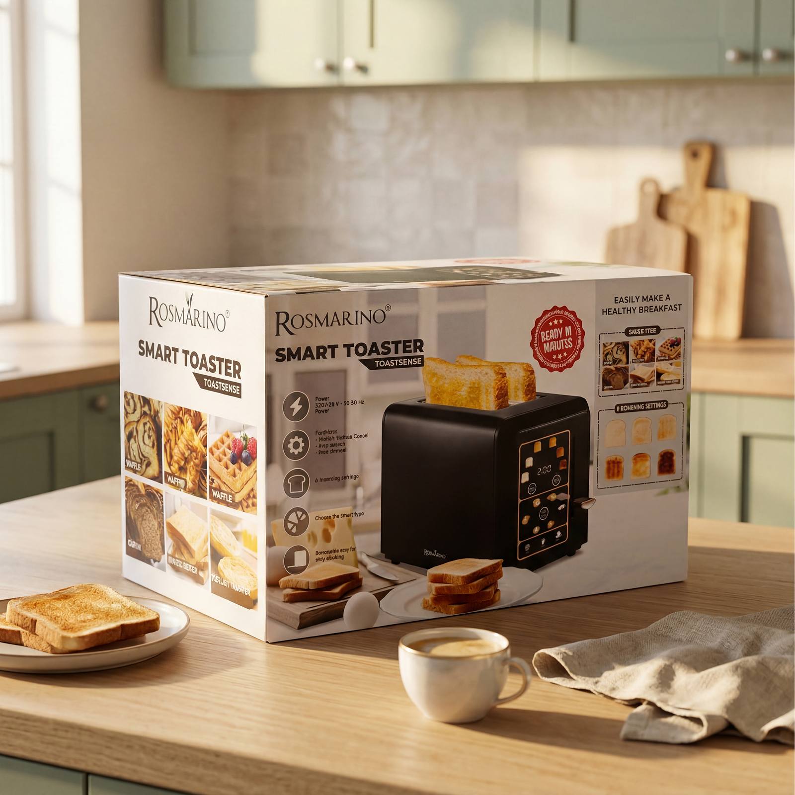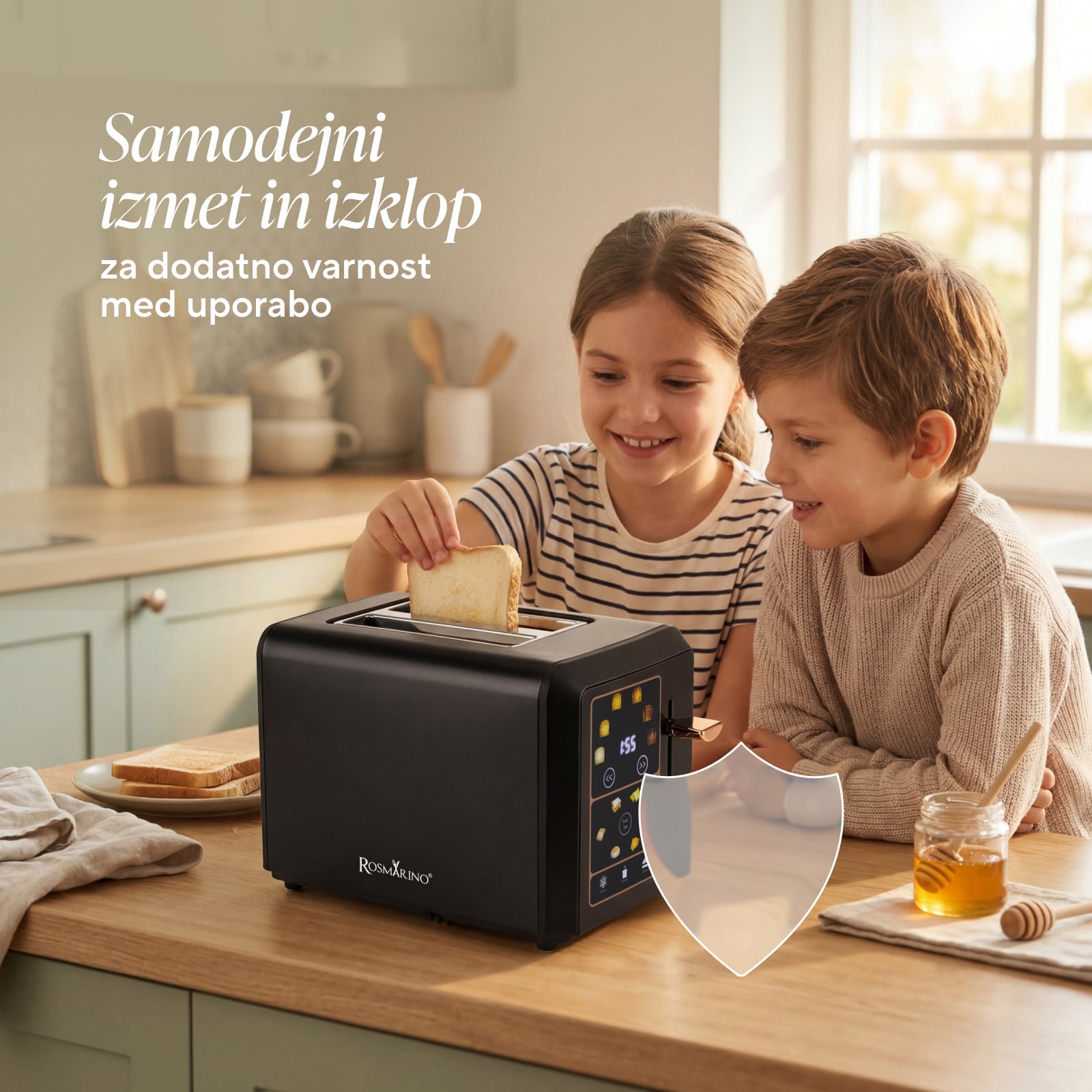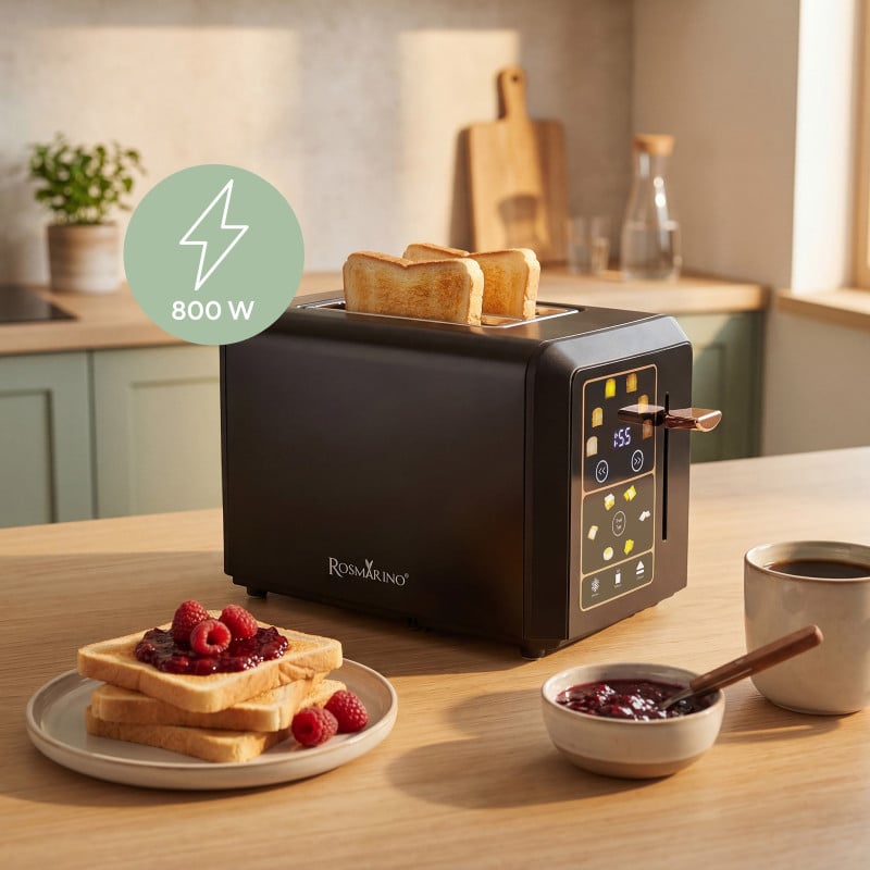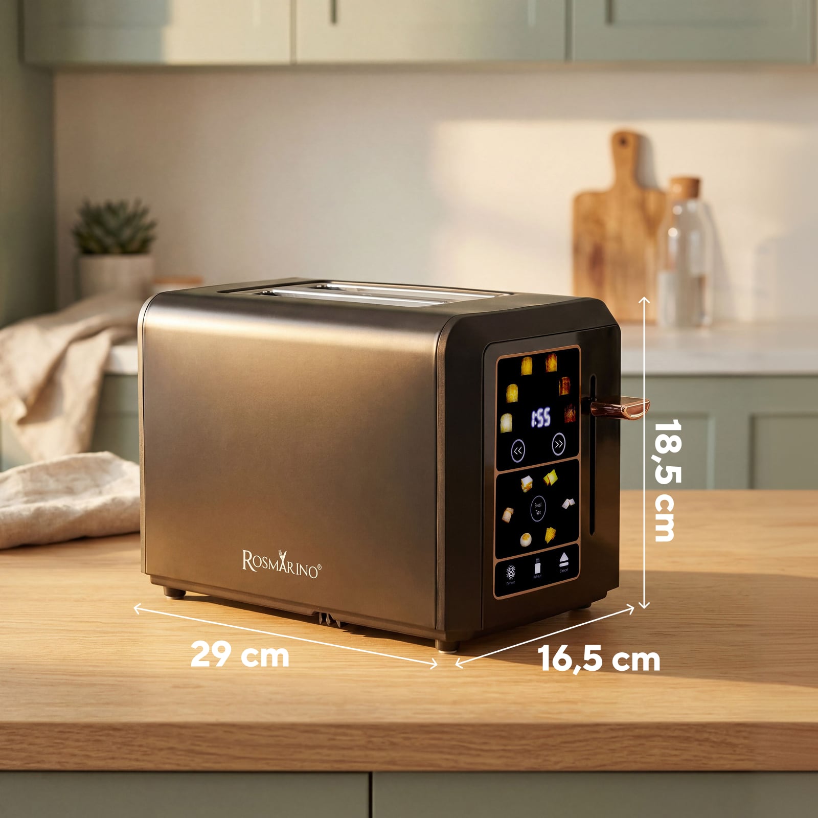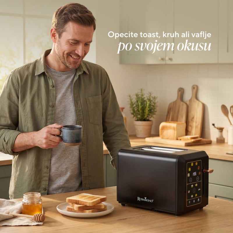 Opekač kruha Rosmarino ToastSense Smart PRO Series z digitalnim LED-zaslonom na dotik vas bo navdušil s kar 6 stopnjami zapečenosti in prikazom odštevanja preostalega časa, da boste vedno vedeli, kdaj bo vaš toast pripravljen.