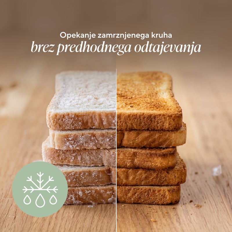 Ko si zaželite svežega in hrustljavega kruha kot iz pekarne, lahko pogrejete popečen kruh s funkcijo pogrevanja Reheat ali pa vzamete rezine iz zamrzovalnika. S posebno funkcijo Defrost lahko popečete zamrznjen kruh brez predhodnega odtajevanja.
