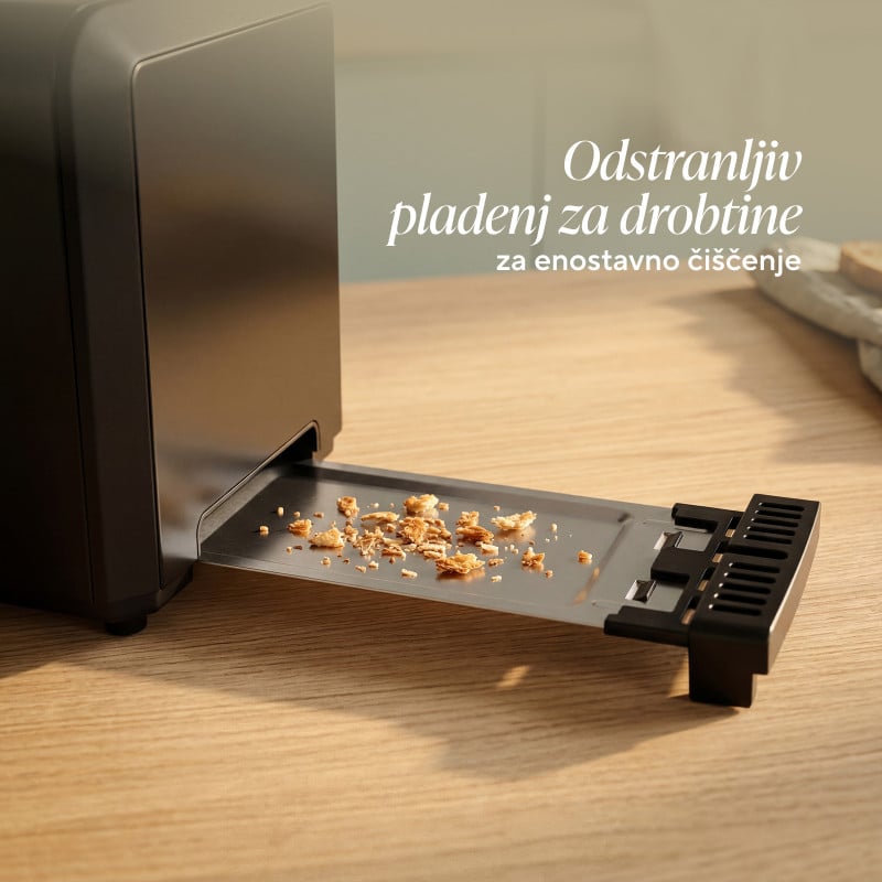 Izvlečni pladenj za drobtine omogoča hitro čiščenje brez razstavljanja naprave. Drobtine preprosto stresete v koš in opekač je spet pripravljen za uporabo.