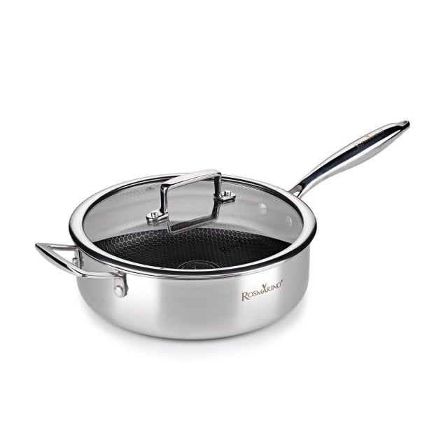 Linija premium posode Rosmarino HexaPRO je prava izbira za tiste, ki želite doseči profesionalne rezultate pri kuhanju. S svojo izjemno vzdržljivostjo in napredno hibridno tehnologijo poskrbi za popolno enakomerno kuhane jedi. Odlikuje jo premium neuničljiv premaz, ki je odporen proti praskam. Brez kompromisov jo lahko uporabljaš na vseh vrstah kuhalnih plošč in tudi v pečici vse do 220 °C. To je premium posoda, ki tvoje kuharske veščine dvigne na višjo raven. S to ponvijo bo postopek sotiranja oziroma hitrega praženja zares uspel. Ponev za sotiranje se uporablja, ko je potrebno drobno narezano zelenjavo ali meso hitro prepražiti na maščobi pri visoki temperaturi. Ker sotiranje običajno zahteva mešanje s stresanjem posode, ti bo zelo prav prišel ročaj, ki se ne segreva.