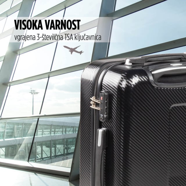 Kovček Scandinavia Carbon Series izstopa že na prvi pogled s svojimi elegantnimi linijami in prefinjenimi poudarki. Vendar lepota ni vse, ponaša se tudi z izjemno varnostjo. Vgrajena 3-številčna ključavnica TSA poskrbi, da so tvoji osebni predmeti varno zaklenjeni v kovčku, zato lahko potuješ brez skrbi. Dodatna prednost te ključavnice je, da jo varnostni organi na letališču, zlasti v ZDA, enostavno odprejo s posebnim ključem in tako ne poškodujejo kovčka.
