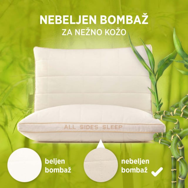 Vzglavnik je prijazen do kože in ne povzroča alergijskih reakcij. Prevleka je narejena iz nebeljenega bombaža, ki je v primerjavi s klasično bombažno tkanino bolj nežen in povsem neškodljiv. Nebeljen bombaž prepoznaš po majhnih črnih pikicah, ki so značilni za njegov naraven videz.