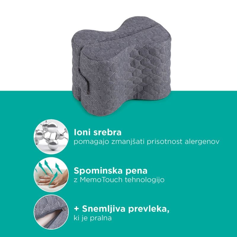 Blazina za kolena MemoSilver VitaSpine je odlična rešitev za ljudi, ki spijo na boku, in vse, ki želijo zmanjšati bolečine v kolkih, nogah in spodnjem delu hrbta. Zasnovana je tako, da se udobno prilega med kolena in omogoča naravno ravno lego hrbtenice med ležanjem. Obenem pomaga zmanjševati pritisk na sklepe in medenico, kar blaži bolečine med spanjem. S svojo ergonomsko obliko in optimalno podporo je tudi idealna rešitev za nosečnice in okrevanje po operaciji. Inovativna spominska pena MemoTouch se optimalno prilagodi telesu, da mu zagotovi potrebno podporo za udoben počitek. Prevleka je obogatena s srebrovimi ioni, ki pomagajo preprečevati razmnoževanje bakterij, kopičenje alergenov in draženje kože. Ker je prevleka snemljiva in pralna, zagotavlja čistejše in bolj zdravo okolje za spanje in počitek.