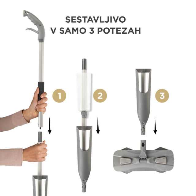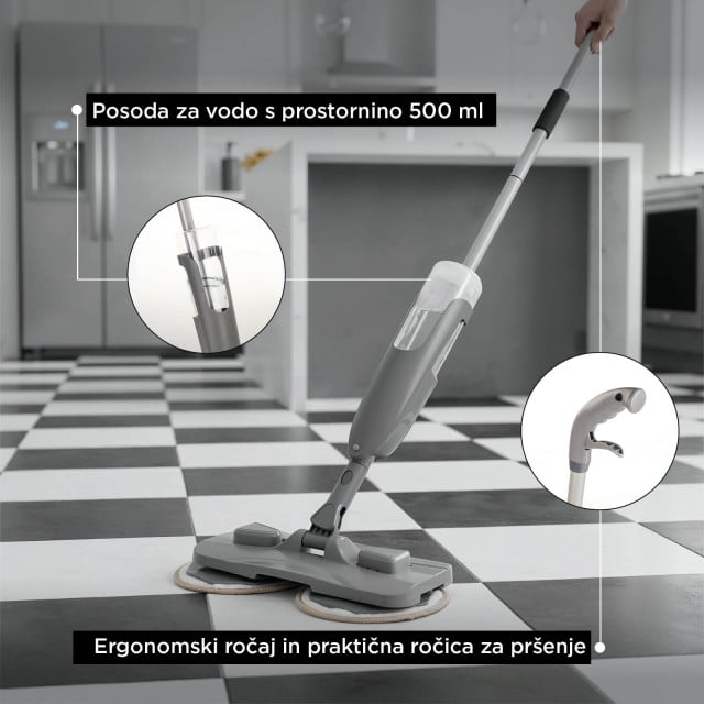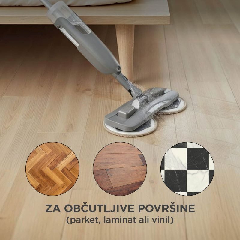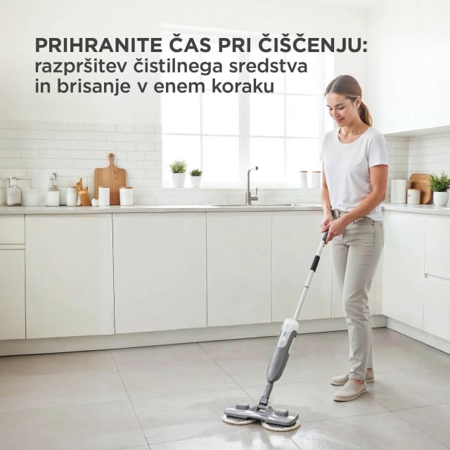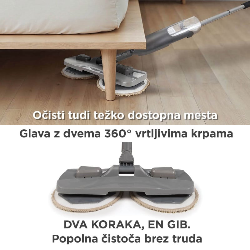Pozabite na vedro, krpe in zamudno čiščenje. S čistilnikom tal Duo Clean boste trde talne obloge očistili v polovičnem času z minimalnim naporom. Preprosto napolnite posodo za vodo, razpršite in pobrišite – vse z enim tekočim gibom.