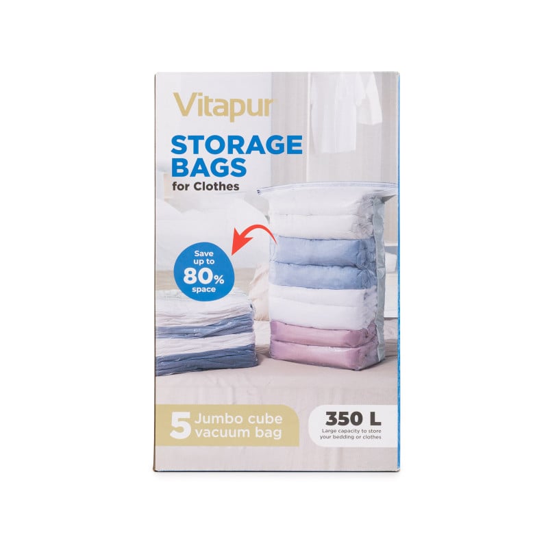 Konec prenatrpanih omar in mrzličnega iskanja prostora za še eno zimsko jakno – z vakuumskimi vrečami Vitapur prevzamete popoln nadzor nad svojim življenjskim prostorom! Ta komplet 5 velikih vreč s prostornino 350 litrov omogoča shranjevanje zimskih oblačil, odej, blazin in drugih tekstilnih izdelkov, ki v omari zavzamejo veliko prostora. Ne glede na to, ali organizirate menjavo sezonskih oblačil, pripravljate kovček za potovanje ali preprosto iščete več prostora v manjšem stanovanju, vam vakuumsko shranjevanje prihrani do 80 % prostora. Povsem enostavno in brez truda – le napolnite vrečo, jo zaprite z drsnikom, iztisnite zrak ročno ali s sesalnikom in uživajte v urejenem prostoru.