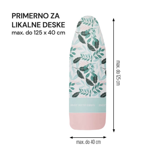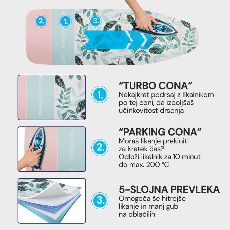 Turbo cona je ozek pas na likalni deski, oblikovan za izboljšanje učinkovitosti drsenja likalnika. Ko z likalnikom nekajkrat podrgnete po njej, zmanjšate trenje in železna plošča likalnika bo spet gladko drsela po tkaninah. Gladko drsenje lahko aktivirate takoj ob začetku likanja in vmes, če opazite, da likalnik začenja težje drseti.