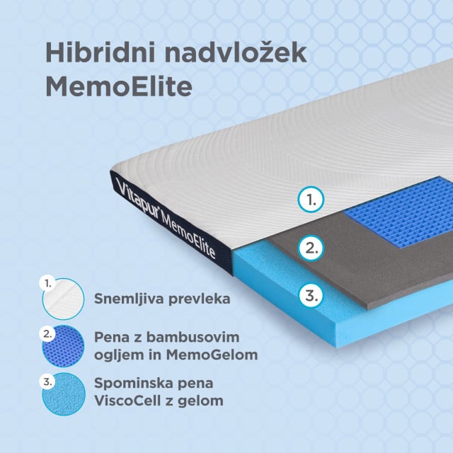 Zgornja pena skriva vložek iz materiala MemoGel, ki je zaradi svoje mrežaste strukture do 50 % bolj zračen in nudi do 25 % boljšo podporo kot običajna spominska pena. Med spanjem se odziva na premike telesa in ga razbremeni, s svojim zračnimi kanali pa učinkovito uravnava temperaturo za miren spanec brez pregrevanja in potenja. Bambusovo oglje v peni deluje protibakterijsko in pomaga preprečevati razmnoževanje bakterij in drugih mikroorganizmov, da površina nadvložka ostane higienična in čista. - Spominska pena ViscoCell z gelom.