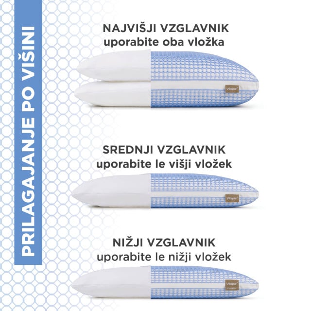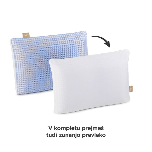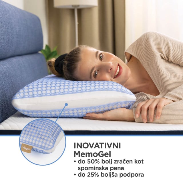 Inovativni material MemoGel je zaradi svoje mrežaste strukture do 50 % bolj zračen in nudi do 25 % boljšo podporo kot običajna spominska pena. Med spanjem se stalno prilagaja položaju tvoje glave in razbremeni vratne mišice za vrhunsko udobje. Material je prijetno mehak in ob stiku s kožo daje občutek svežine. - Višji vložek z mikrovlakni.
