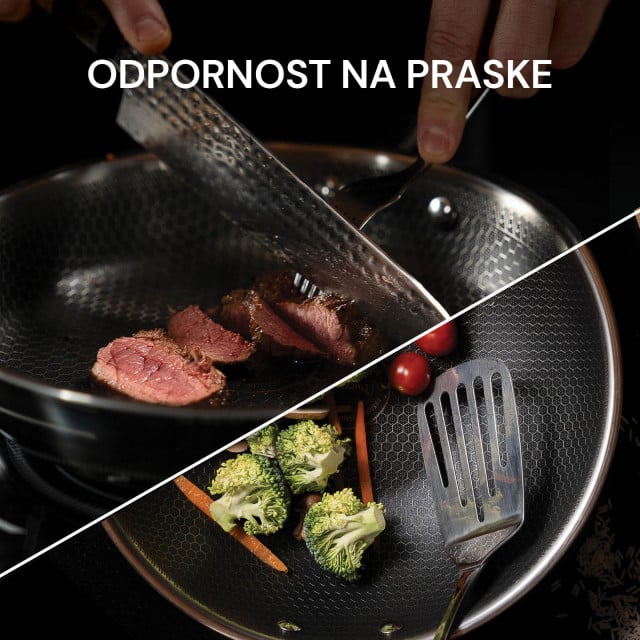 Vsa linija posode HexaPRO ima neuničljivo plast, ki je odporna proti praskam. To pomeni, da niti noži niti kovinske lopatice ne uničijo površine posode. Lasersko vrezani jekleni šestkotniki zagotavljajo trpežno površino, ki omogoča enakomerno porazdelitev toplote in popolno kuhanje.