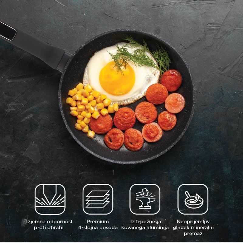 Zgornji neoprijemljiv mineralni premaz omogoča kuhanje z minimalno količino maščobe, zato bodo tvoji obroki bolj zdravi, a vseeno enako slastni in polni hranilnih snovi. Ker se posoda iz kovanega aluminija posebej hitro in učinkovito segreje, za pripravo hrane porabiš manj časa in energije.
