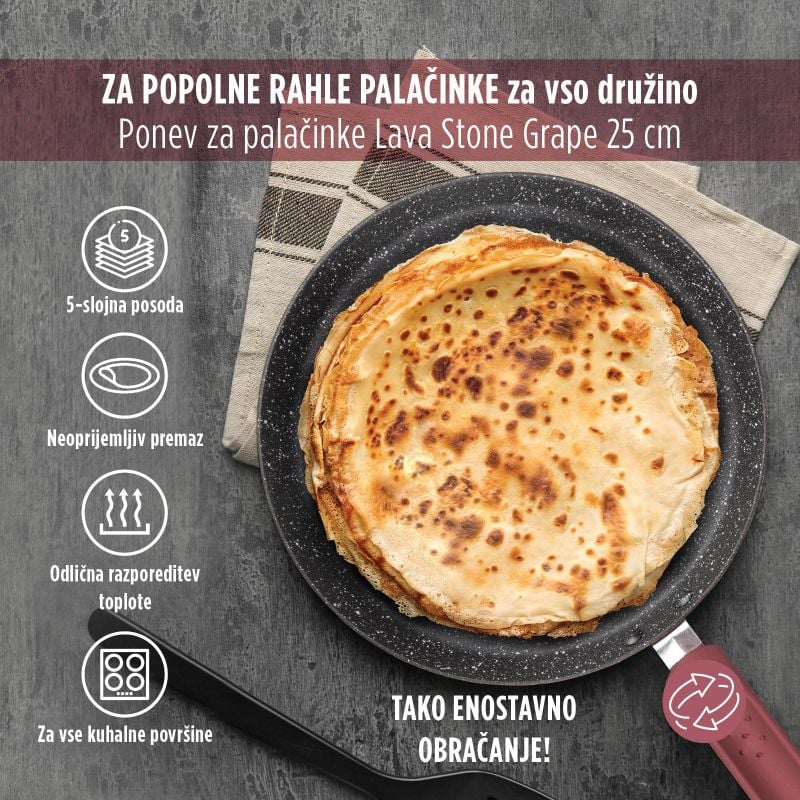 Ponev za palačinke Lava Stone Grape ti omogoča pripravo najbolj slastnih in puhastih palačink, jajc, burgerjev ali tortilj. Inovativni hrapavi neoprijemljiv premaz v videzu vulkanskega kamna omogoča naraven način kuhanja in pečenja, z manj maščobami. Primerna je za vsa kuhališča, tudi indukcijo. Zaradi neoprijemljivega premaza tudi po zunanji strani posode je čiščenje posode še enostavnejše. Vsa premium posoda iz linije Lava Stone Grape temelji na večslojni sestavi, s čimer je zagotovljena dolga življenjska doba in vzdržljivost posode.