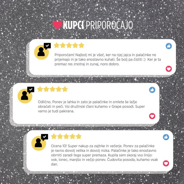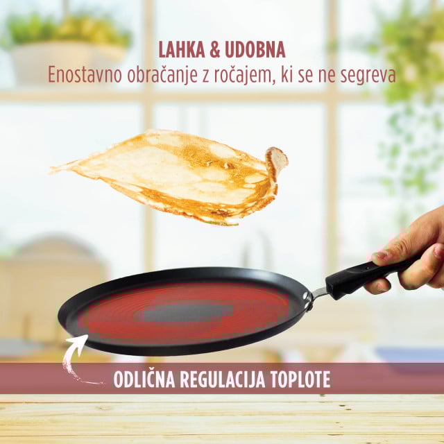 Lahka teža, ergonomski ročaj in neoprijemljiv premaz so najboljša vstopnica do profesionalnega obračanja palačink. Pripravljaj popolne palačinke, omlete, mehiške tortilje ali jajčka na oko - vse v eni posodi! Posebej razvita sodobna tehnologija kuhanja sovpada z enim najstarejših načinov priprave hrane - na kamnu. Zaradi svojih izjemnih lastnosti lahko pri peki in kuhanju uporabljaš še manj olja ali masla.