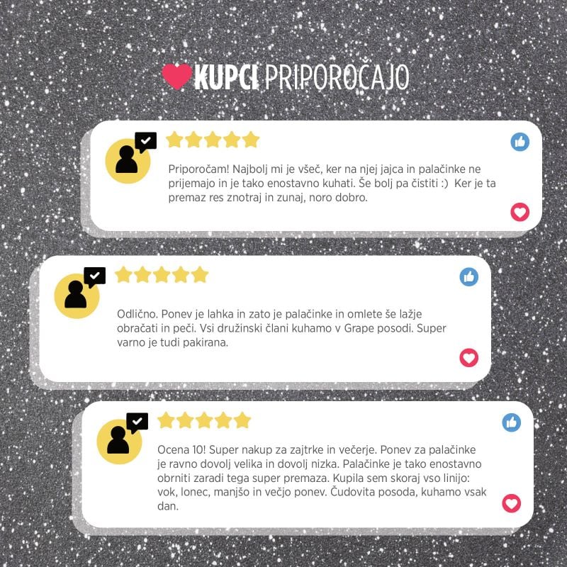 • Recept za popolne palačinke ali omlete? Potrebuješ le kakovostno ponev Grape z ergonomskim ročajem za lažje obračanje in neoprijemljivim premazom, ki tvoje palačinke speče enakomerno.
