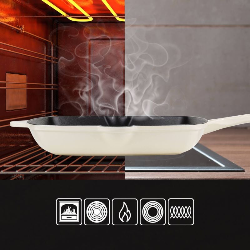 Ponev lahko uporabljaš na vseh vrstah kuhalnih plošč. Ker je odporna na temperature do 220 °C, jo lahko uporabljaš tudi v pečici in na žaru. Za razliko ostalih kuhinjskih posod zahteva kuhanje v litoželezni posodi bistveno nižjo temperaturo za odličen rezultat. Za maksimalno učinkovitost je namreč ni treba pregrevati.