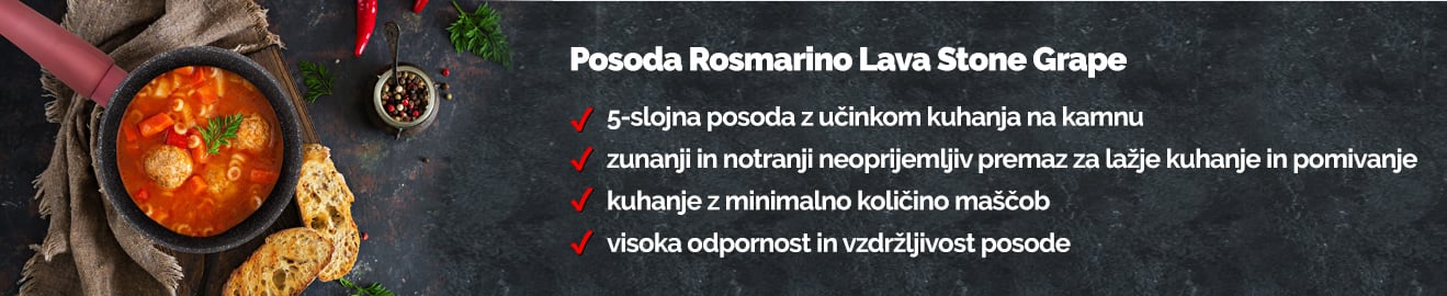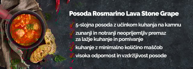 Rosmarino Lava Stone Grape spada v rang premium posode z inovativnim in tehnološko dovršenim hrapavim mineralnim premazom. Neoprijemljiv premaz v videzu vulkanskega kamna omogoča naraven način kuhanja in pečenja z malo maščobami. Hrana tako zadrži vse potrebne vitamine in minerale, ki jih naše telo potrebuje za zdrav način življenja. Primerna je... -