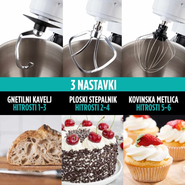• Priloženi 3 nastavki in 5,5 l jeklena posoda.