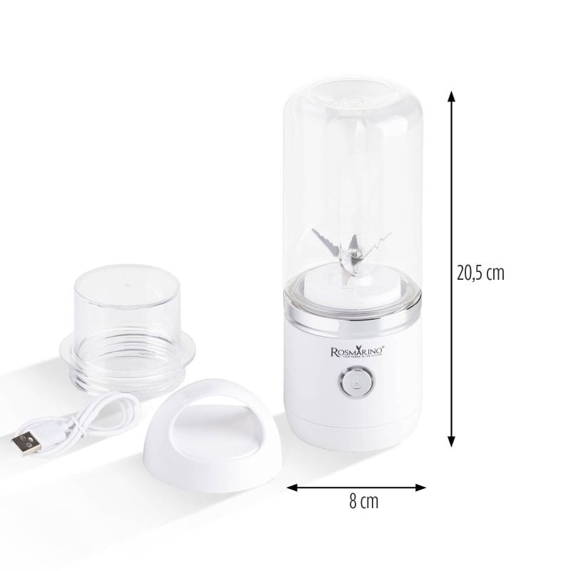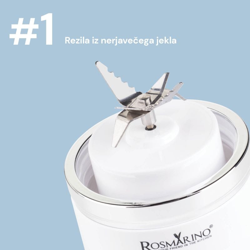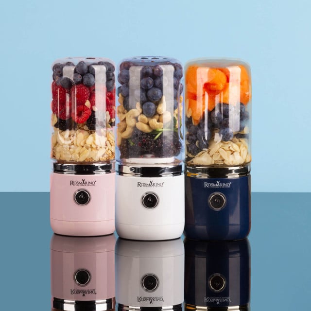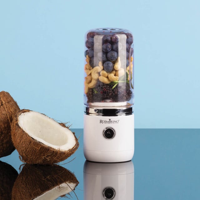 Prenosnemu blenderju je priložen kozarec brez BPA, ki ga napolniš s svojim najljubšim sadjem in zelenjavo ter tekočino. Samo pritisneš na gumb, zblendaš ter zapreš kozarec s priloženim pokrovom, da lahko napitek brez skrbi vzameš na pot. Ko je na poti čas za malico, ti na pomoč priskoči blender Rosmarino NutriMax 2 GO.