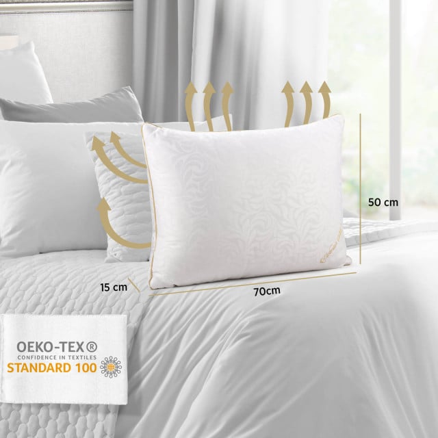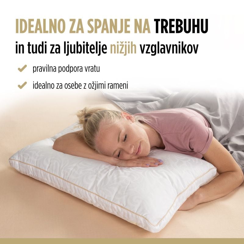 Vzglavnik je napolnjen z najfinejšimi silikoniziranimi poliestrskimi vlakni, ki so najbližji približek pravemu gosjemu puhu. Najkakovostnejša mikrovlakna naredijo površino vzglavnika mehko in udobno, hkrati pa nudijo zadostno podporo vaši hrbtenici.