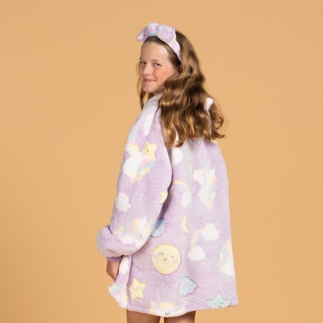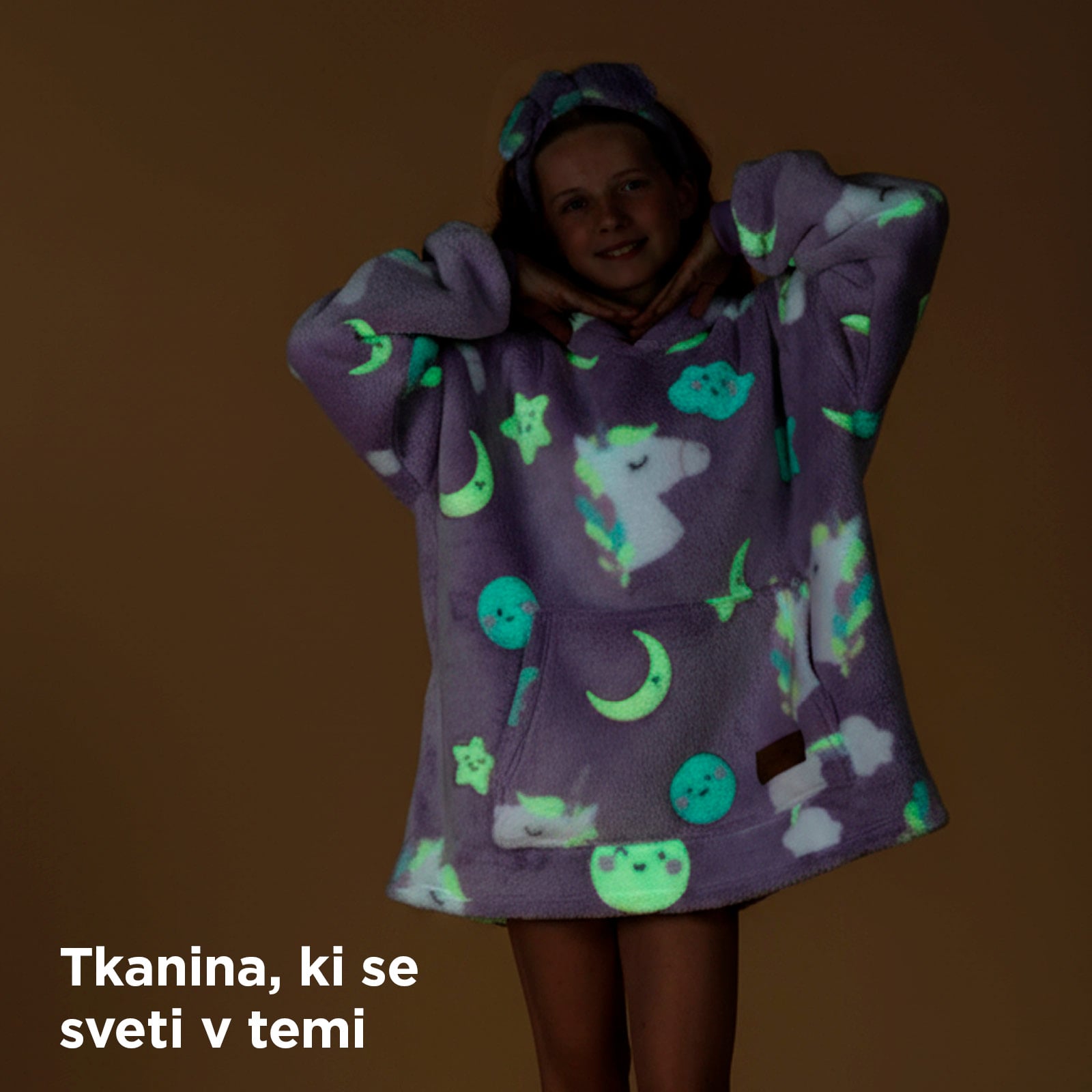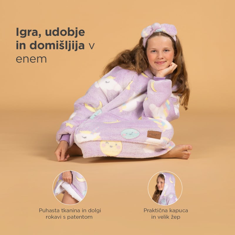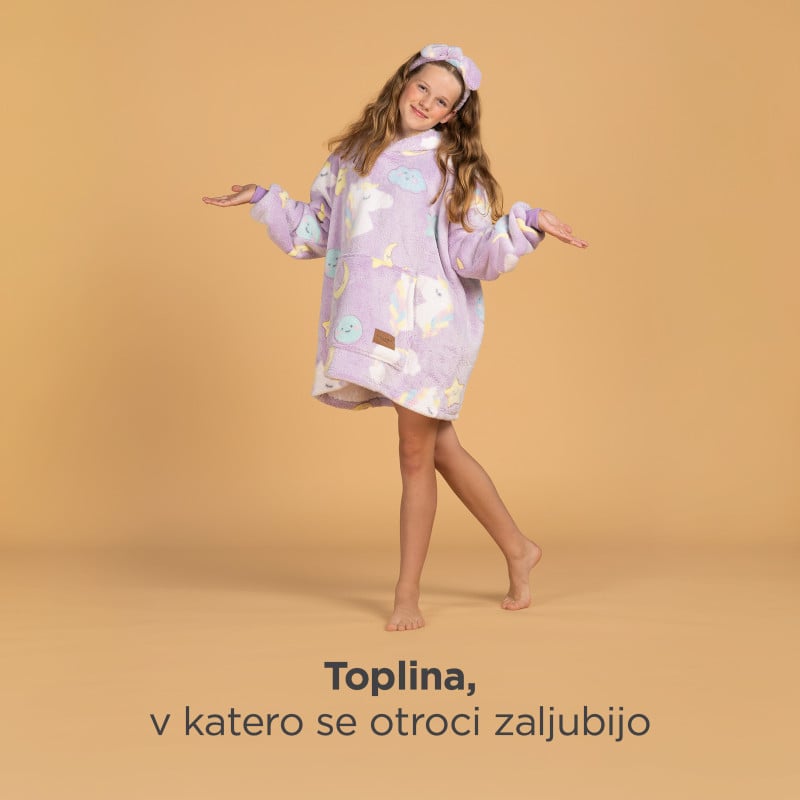 Predstavljajte si: otrok leži na kavču in gleda risanke, vi ga lepo pokrijete z odejo, da ga ne bo zeblo. A že naslednji trenutek odejo zbrca s sebe, ker so otroci le stežka pri miru. Ali pa sedi na tleh in ima čisto hladne roke ter stopala, ker ga odeja ovira med igro. Rešitev je hoodie odeja z rokavi Svilanit. Ta mehak, puhast pulover poskrbi, da je otrokom toplo v vsakem trenutku ne glede na to, ali počivajo ali se lovijo po stanovanju. S kapuco in širokimi rokavi vedno ostane na svojem mestu in daje občutek, kot bi bili v toplem zavetju starševega naročja. Mehka tkanina spominja na plišaste igračke, zato bodo hoodie odejo nosili z nasmehom, starši pa bodo mirni, ker vedo, da otroka ne zebe. Dodatno bodo otroke navdušili igrivi motivi, ki se pri večini modelov svetijo v temi. Pulover, odeja in zabavna igrača – najboljša kombinacija za srečne otroke in zadovoljne starše.