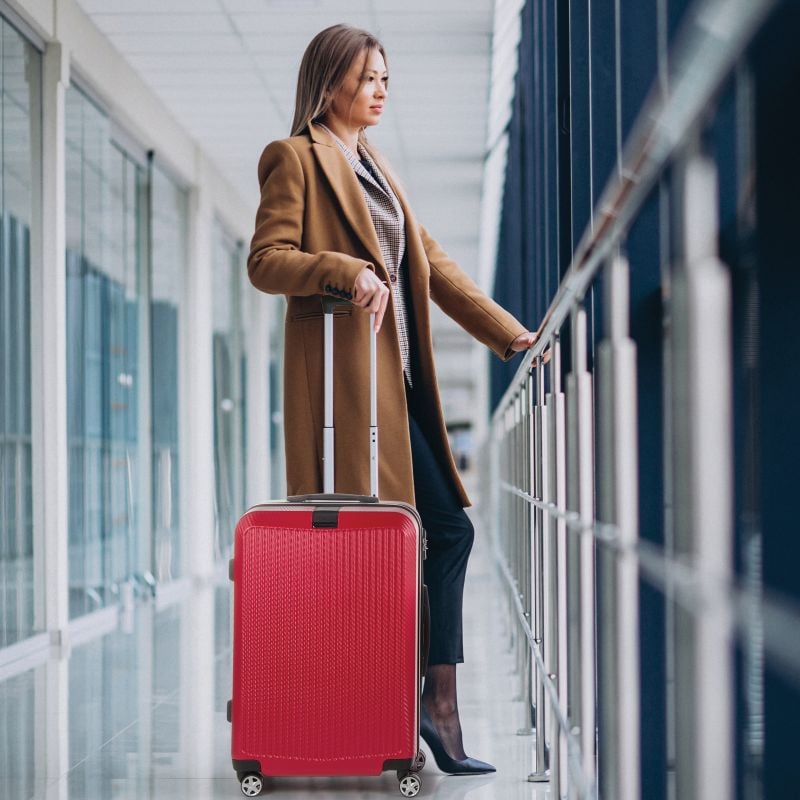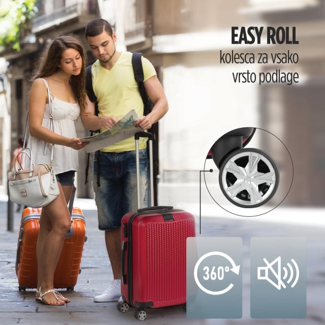 4 dvojna 360° vrtljiva kolesca omogočajo tiho in varno vožnjo v katerokoli smer, brez zatikanja. Njegova izjemna praktičnost se kaže v nastavljivem teleskopskem ročaju, ki ti olajša prevoz še tako težke prtljage. Enostavno si ga prilagodi na primerno višino.