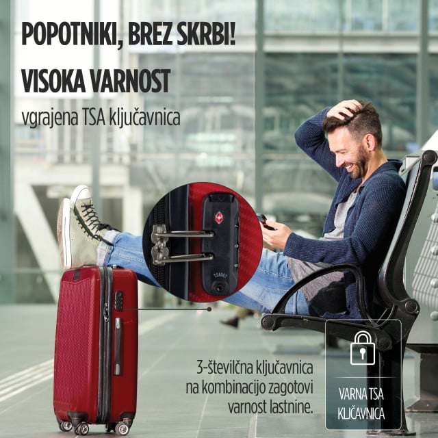 Vgrajena 3-številčna TSA ključavnica poskrbi za varno hrambo in še bolj brezskrbne dopustniške dni. TSA ključavnica olajša predvsem potovanje v ZDA, kjer kovčke med pregledom odprejo s posebnim ključem in ne poškodujejo ključavnice.