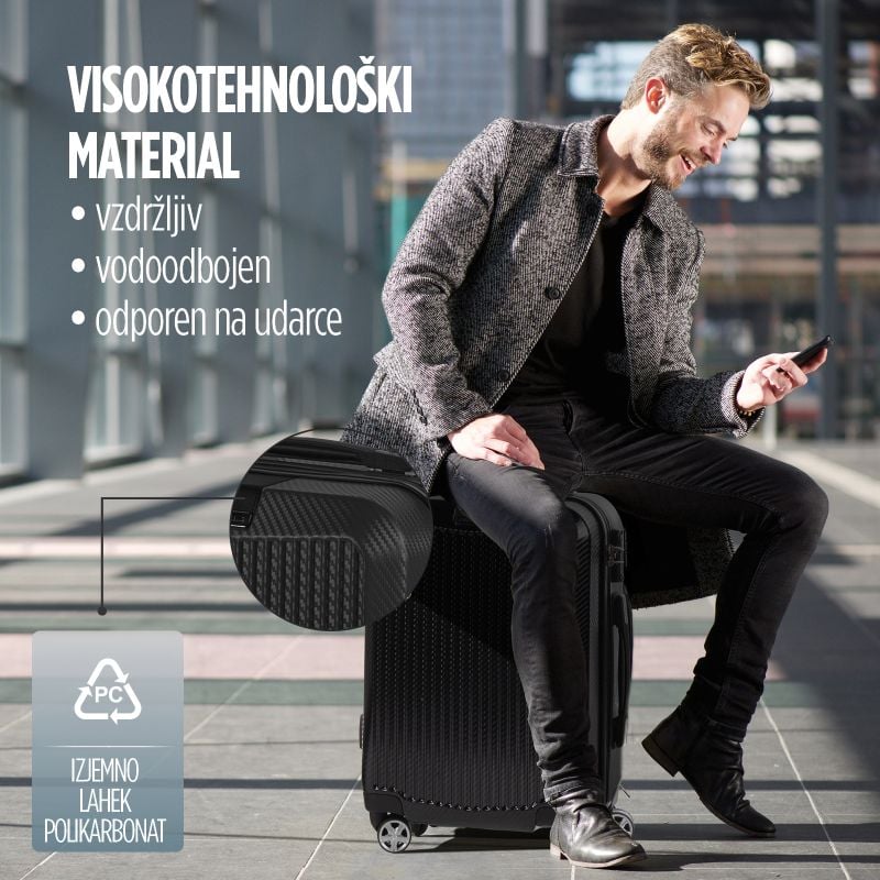 Visokotehnološki polikarbonat je odporen na udarce, izredno močan in trpežen. Trdo ohišje, ki je vodoodporno, zato bo zato najboljša izbira za vaše počitnice. Vzdržljivi kovčki bodo zdržali tudi po več let.