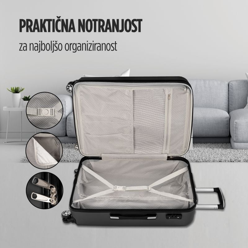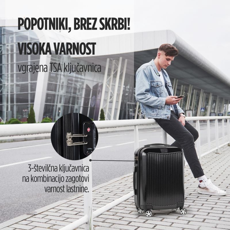 Vgrajena 3-številčna TSA ključavnica poskrbi za varno hrambo in še bolj brezskrbne dopustniške dni. TSA ključavnica olajša predvsem potovanje v ZDA, kjer kovčke med pregledom odprejo s posebnim ključem in ne poškodujejo ključavnice.