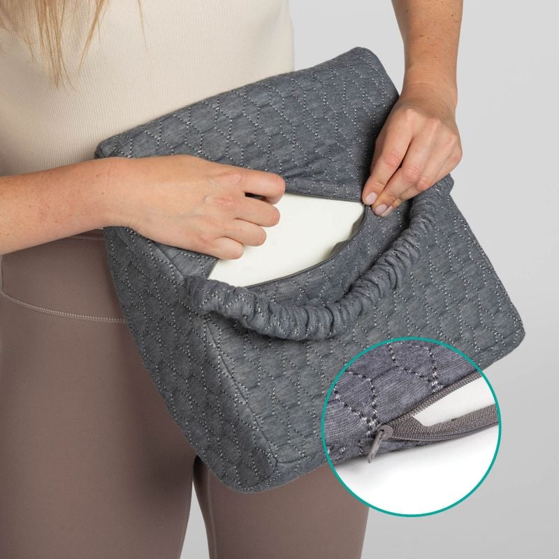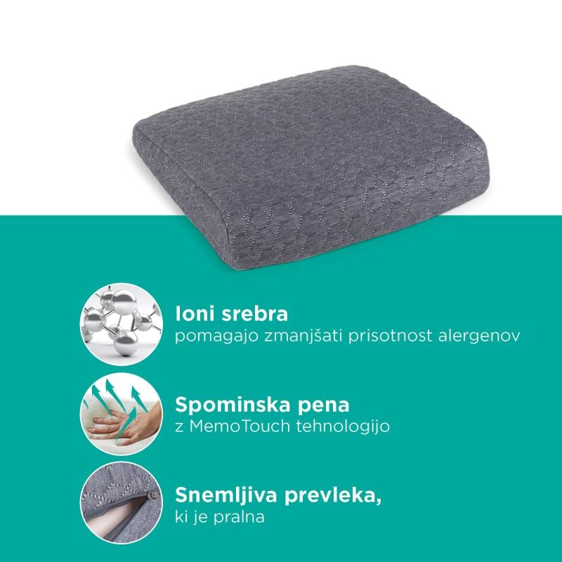 Sedežna blazina MemoSilver VitaSpine poskrbi, da ti je med dolgotrajnim sedenjem udobno na vsaki površini. S svojo ergonomsko obliko podpira pravilno lego bokov, trtice in spodnjega dela hrbta, da med sedenjem razbremeni točke pritiska in izboljša splošno telesno držo. Blazina, izdelana iz spominske pene MemoTouch, se prilagodi obliki tvojega telesa in ti zagotavlja optimalno udobje med sedenjem za mizo, vožnjo avtomobila ali gledanjem televizije na kavču. Snemljiva prevleka je obogatena s srebrovimi ioni, ki pomagajo preprečevati razmnoževanje bakterij, kopičenje alergenov in draženje kože.