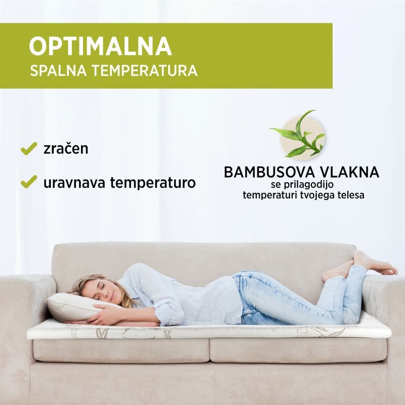 Prevleka je obogatena z bambusovimi vlakni. ki naravno pomagajo k uravnavanju temperature telesa med spanjem. Prava telesna temperatura in odvajanje odvečne toplote telesa je ključ do bolj naspanih noči.