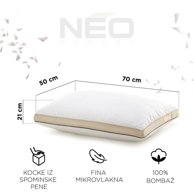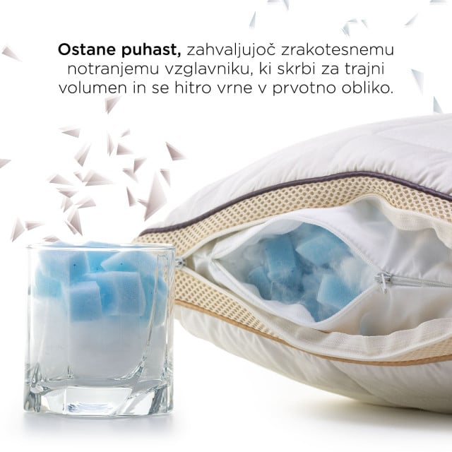 Polnilo vzglavnika vsebuje kombinacijo rezane spominske pene v obliki kock in najfinejših ClimaSoft mikrovlaken, ki skupaj zagotavljajo pravilno podporo glave in vratu, hkrati pa nudijo prijetno udobje med spanjem.