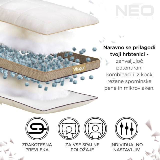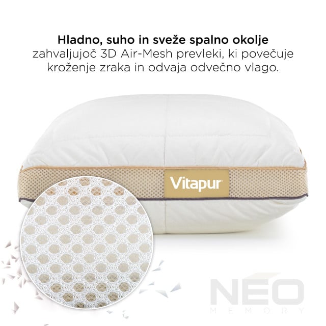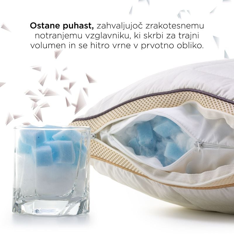 Stranski rob prevleke je narejen iz tkanine 3D AirMesh, ki povečuje zračenje. Klimatski modul povečuje kroženje zraka in tako uravnava temperaturo vzglavnika. - Notranja zrakotesna prevleka