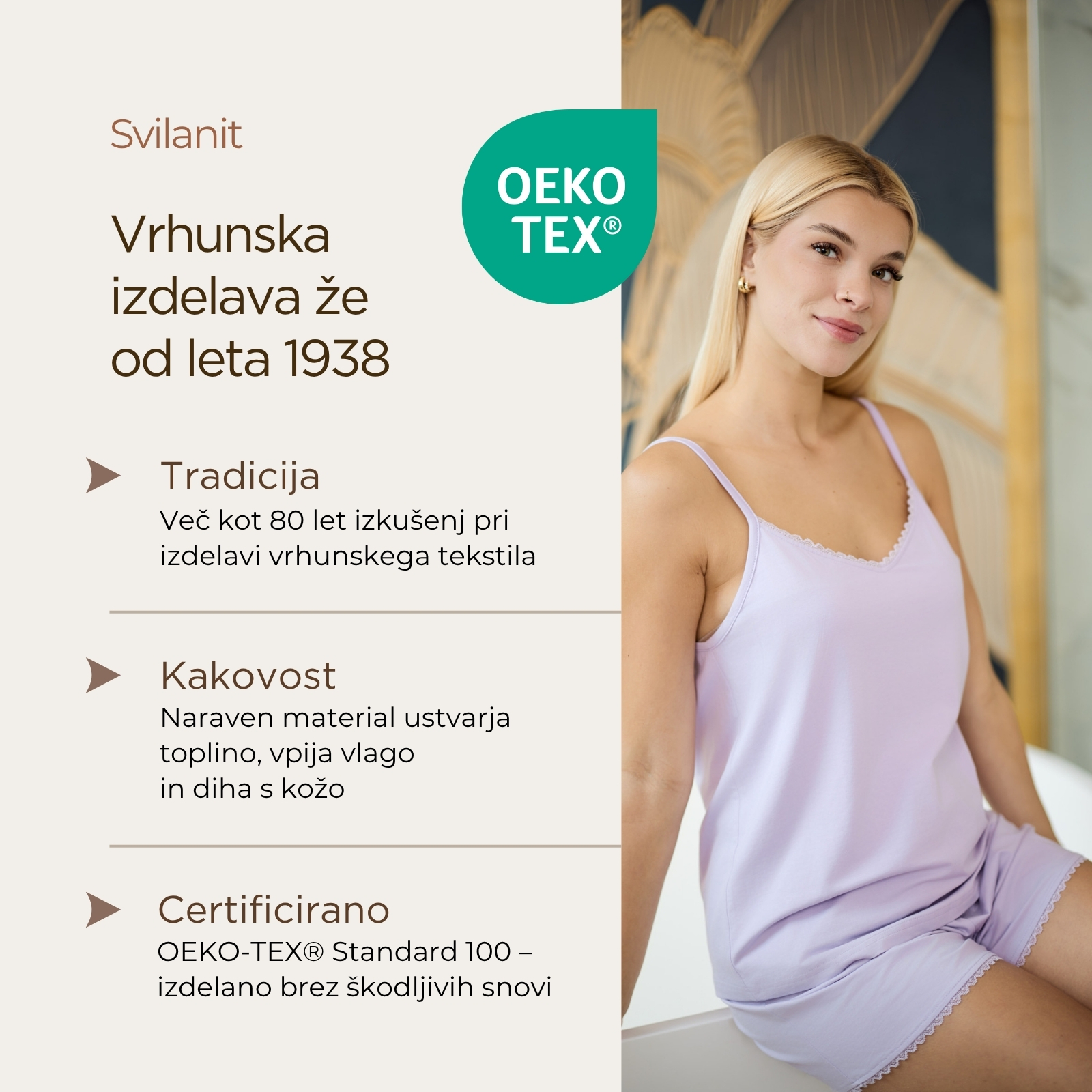 Pižame in jutranje halje Svilanit so izdelane iz naravne mešanice bambusove viskoze, bombaža in elastana. Ta material je izjemno mehek, zračen in raztegljiv ter zagotavlja popolno udobje. Vse izdelke odlikuje tudi prestižni certifikat OEKO-TEX® Standard 100.