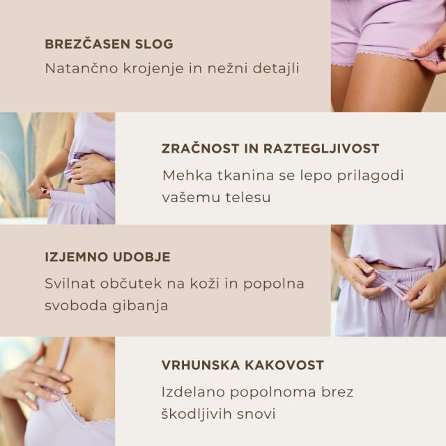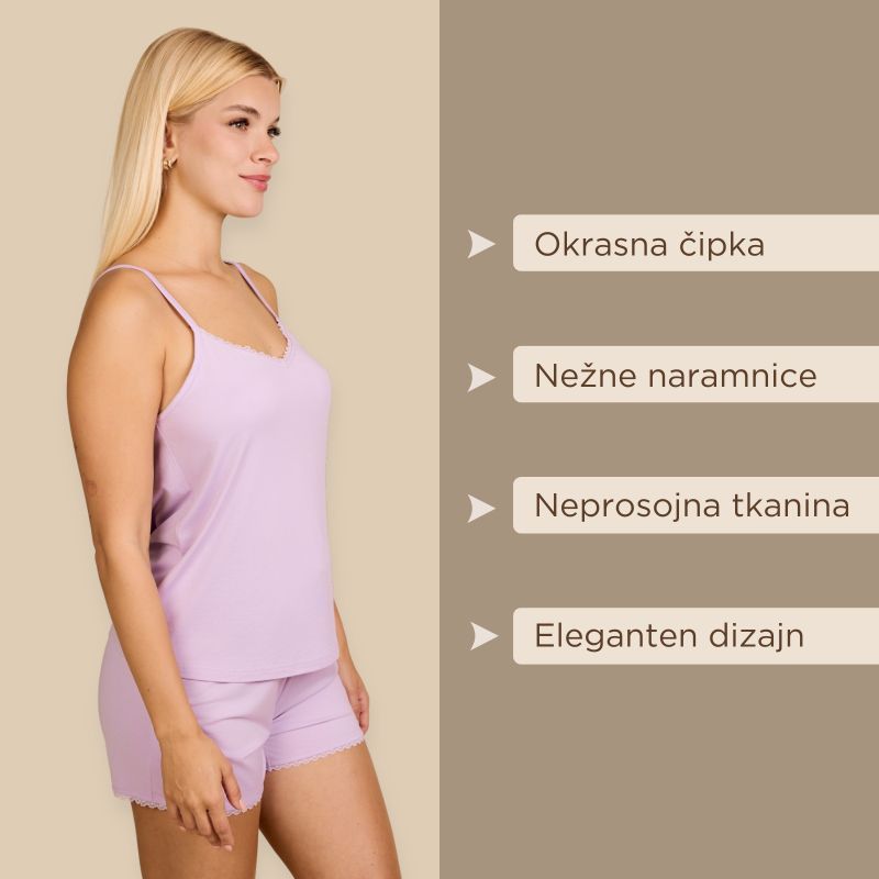 • Kratka pižama z nežnimi naramnicami in prefinjeno čipko na dekolteju ter robu hlač