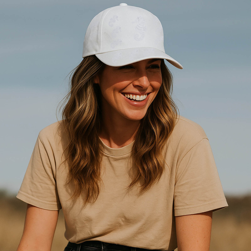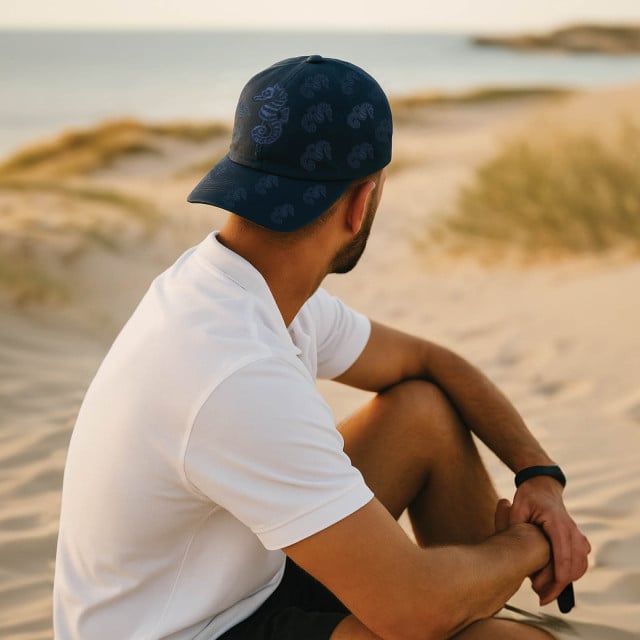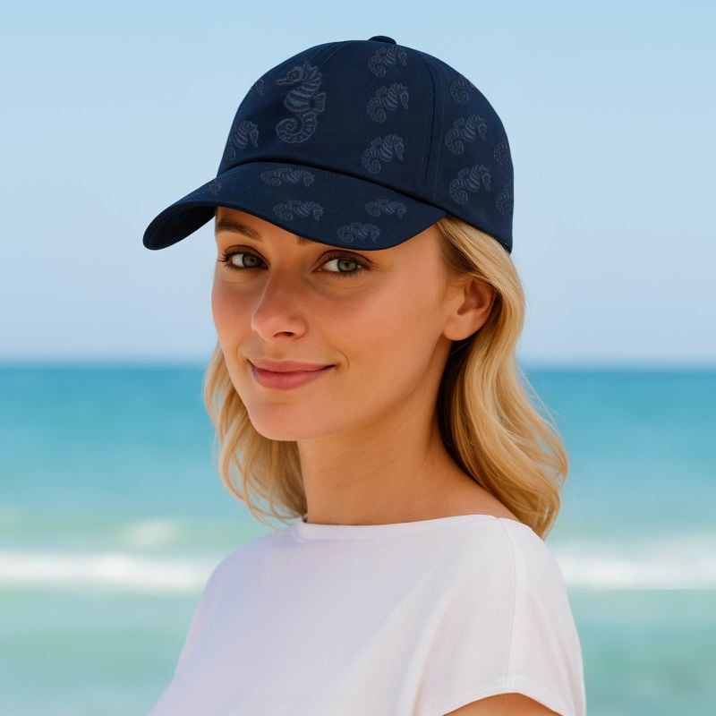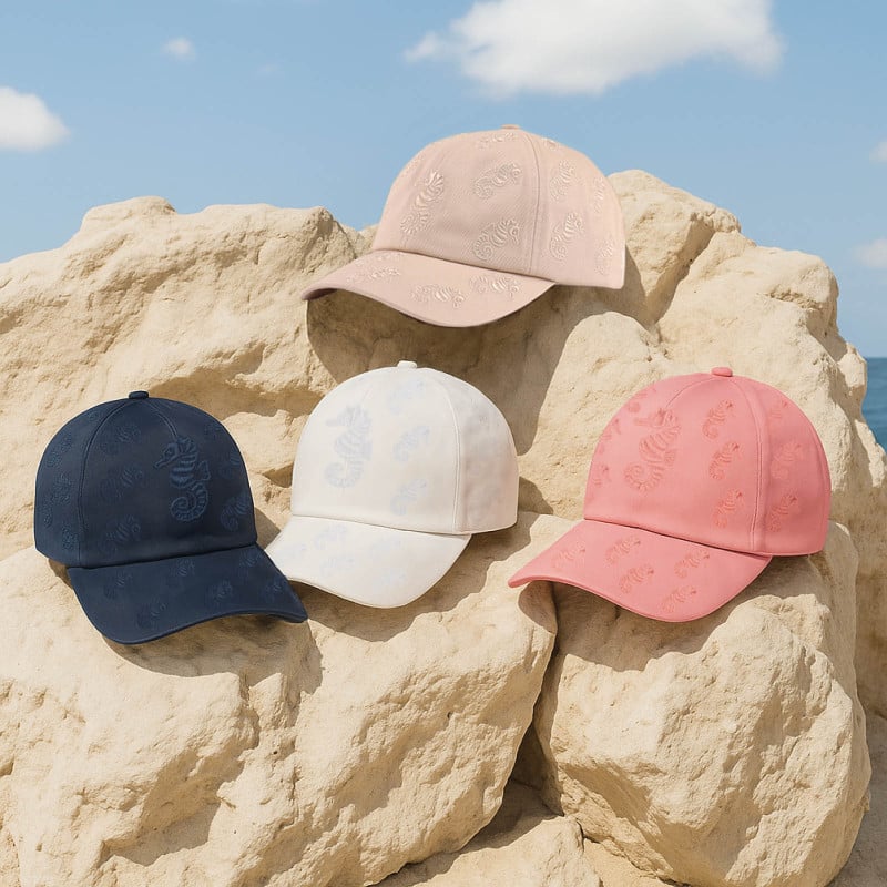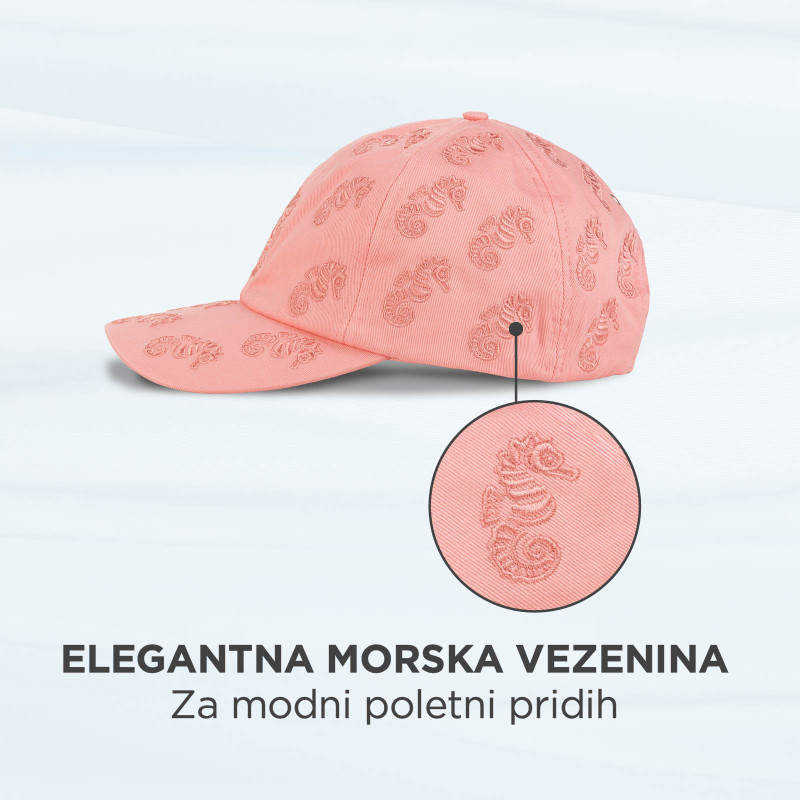 Skrbno izvezeni morski konjički po celotni površini kape ji dajejo pečat sredozemskega sloga in poletne brezskrbnosti. Ta edinstveni detajl spremeni to kapo v modni dodatek, ki bo čudovito dopolnil vsak poletni videz.