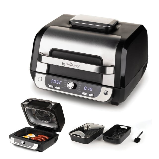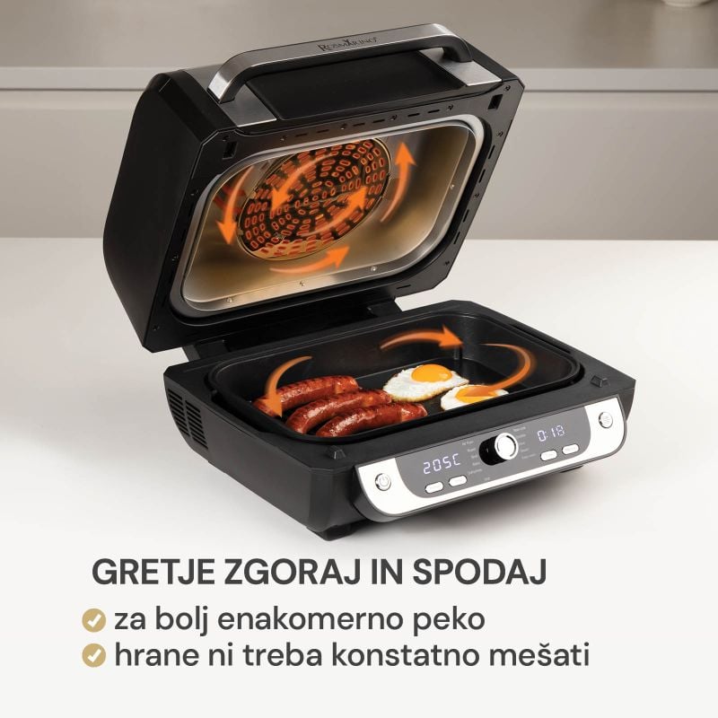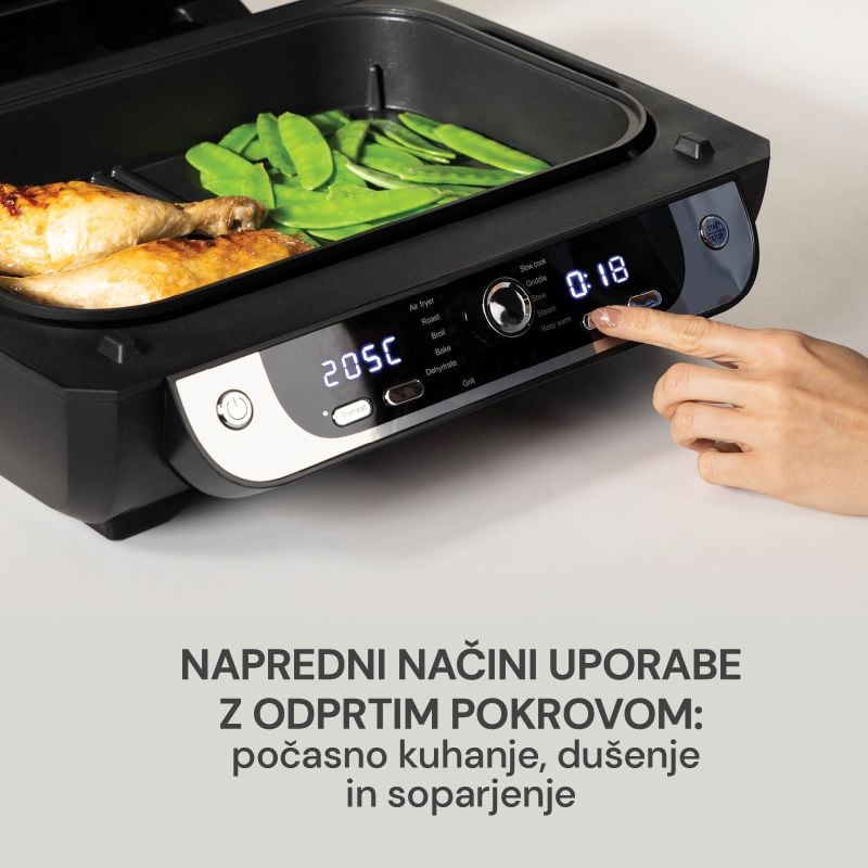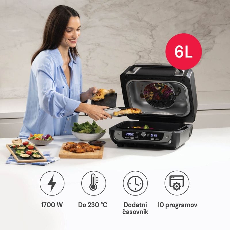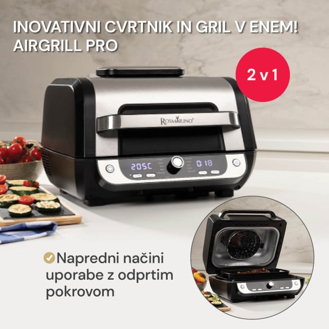 V kompletu s cvrtnikom na vroč zrak AirGrill Pro dobiš tudi pekač iz litega aluminija in stekleno pokrovko. To pomeni, da cvrtnik lahko uporabljaš tudi z odprtim pokrovom za soparjenje, počasno kuhanje in dušenje.