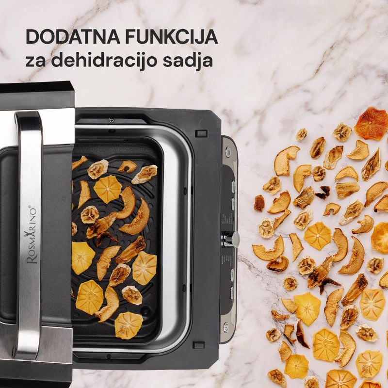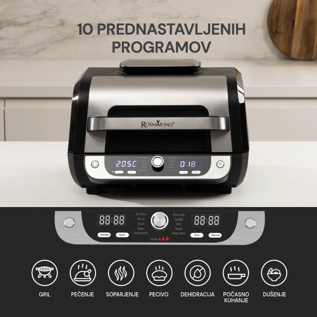 Cvrtnik nudi prednastavljene programe za številne jedi, lahko pa tudi ročno nastavljaš čas in temperaturo kuhanja. Poleg običajnega cvrenja, pogrevanja in pečenja ti omogoča tudi odtajevanje mesa, peko na žaru, zgornje in spodnje gretje ter še marsikaj.
