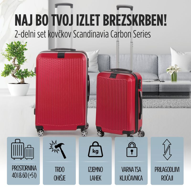 2-delni set kovčkov Scandinavia Carbon Series iz trdega ohišja predstavlja novo generacijo kovčkov. 40-litrski in 60-litrski kovček je najboljša izbira za raznolika potovanja, izlete in je kot nalašč za vse, ki imate radi dobro organizirano prtljago. Visokotehnološki polikarbonat je vodoodporen, odporen na udarce, izredno močan in trpežen, odporen na udarce in praske. 4 dvojna 360° vrtljiva kolesca, teleskopski ročaj in TSA ključavnica poskrbijo za še bolj brezskrbna potovanja. Večji kovček omogoča tudi povečanje prostornine za dodatnih 5 litrov.