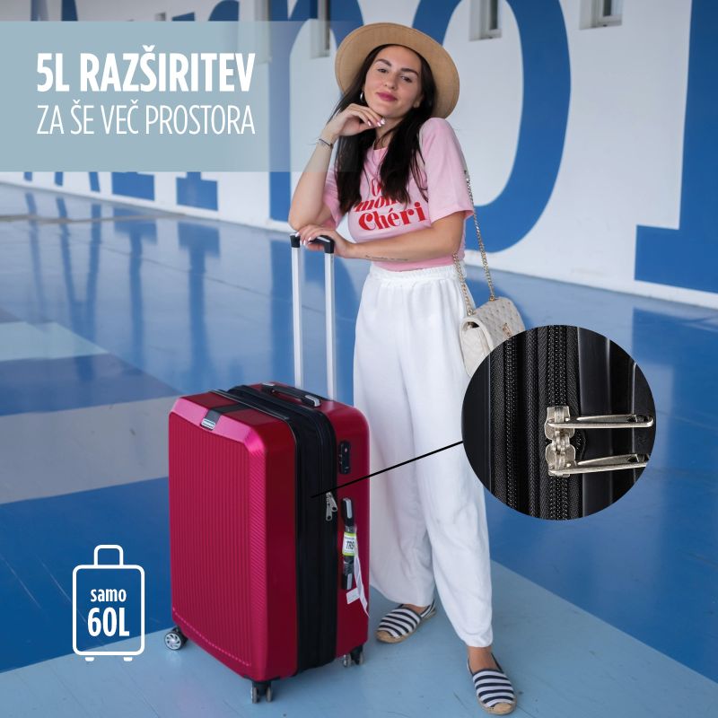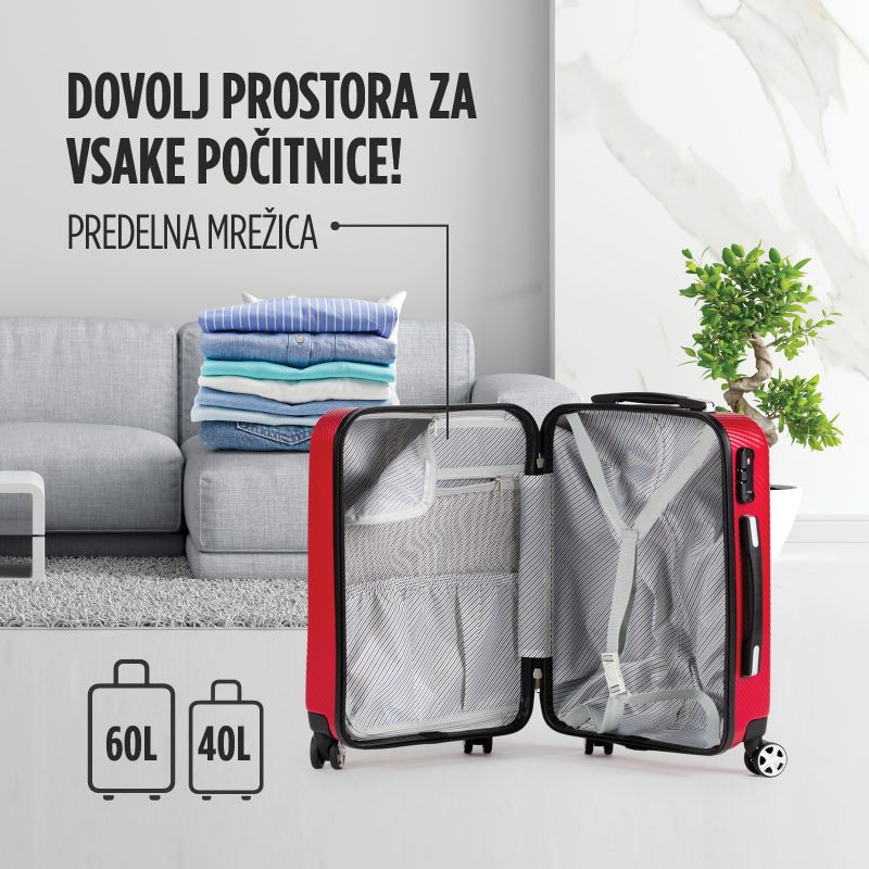 • 40-litrski kovček ustreza standardom kabinske ročne prtljage kar 90 % letalskih družb (IATA standard).