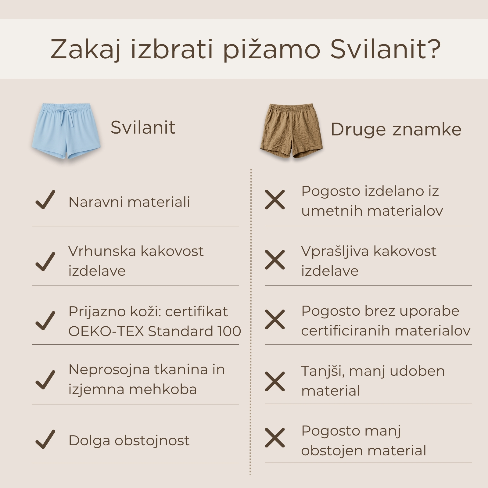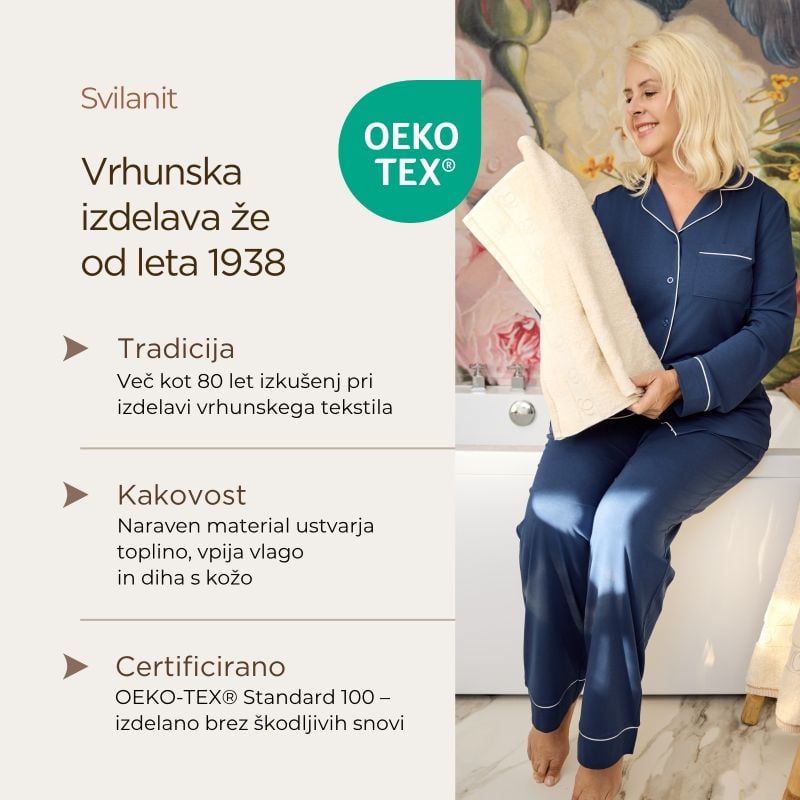 Pižame in jutranje halje Svilanit so izdelane iz naravne mešanice bambusove viskoze, bombaža in elastana. Ta material je izjemno mehek, zračen in raztegljiv ter zagotavlja popolno udobje. Vse izdelke odlikuje tudi prestižni certifikat OEKO-TEX® Standard 100.