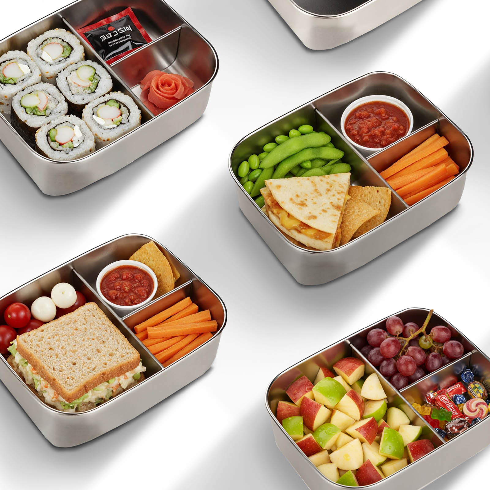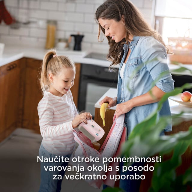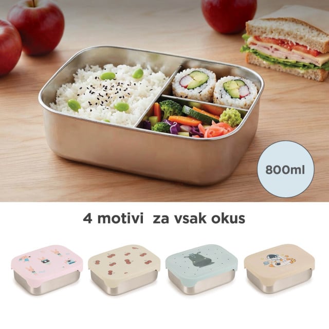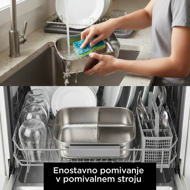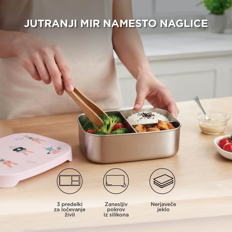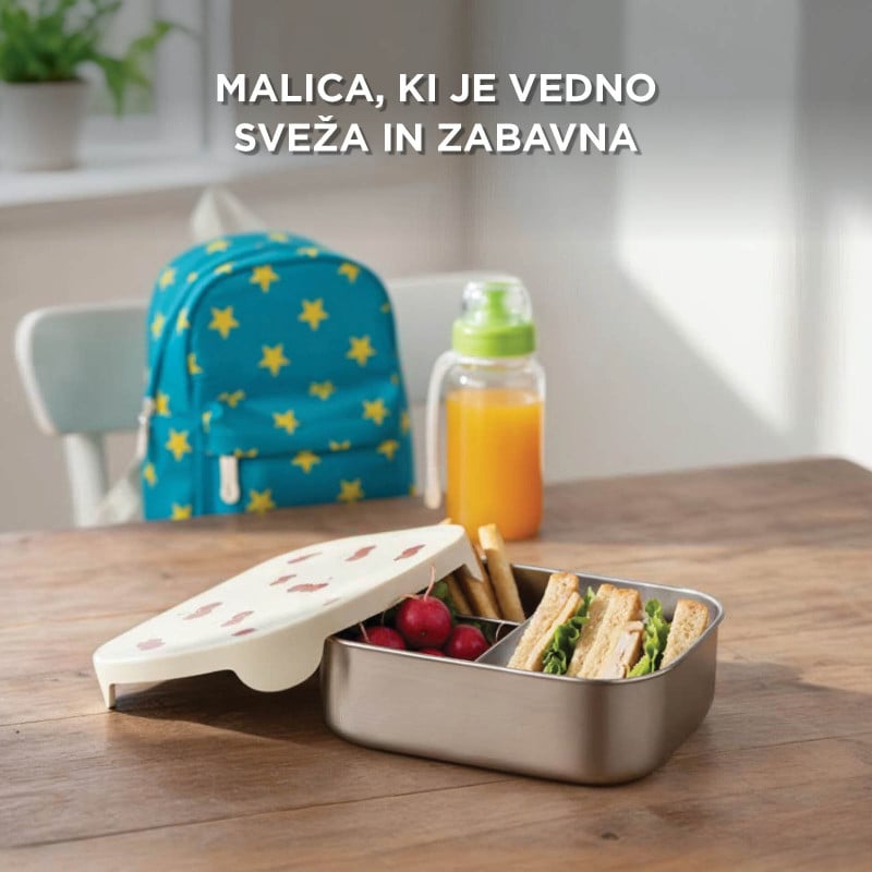 Predstavljajte si, da otrok odpre posodo za malico in vidi jagode, ki so še vedno rdeče, ne pa obarvane od borovničevega soka. Oreščki so hrustljavi in ne zmehčani od vlage. Sendvič kompakten, ne pomečkan. Predelki v posodi za malico omogočajo, da vsaka sestavina ohrani svojo teksturo in okus od kuhinje do mize.