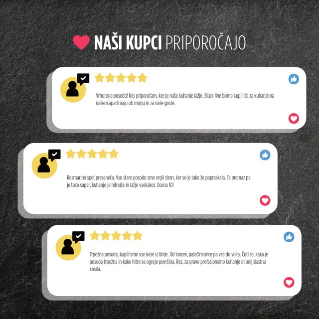 • Vsa naša posoda je zasnovana po najvišjih standardih in ne vsebuje zdravju škodljivih kemikalij PFOA ali kakršnih koli drugih škodljivih snovi.