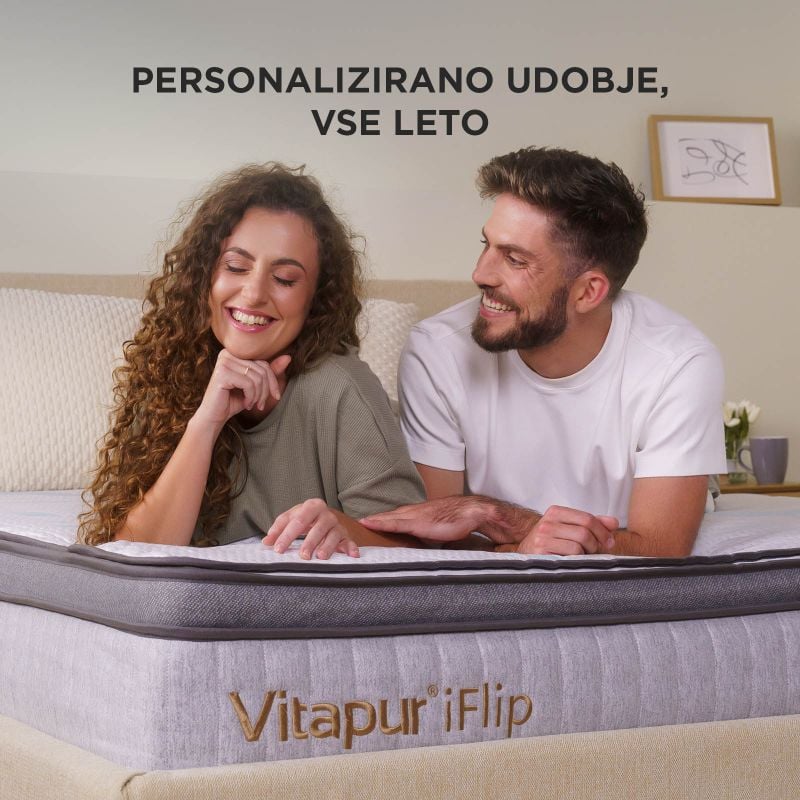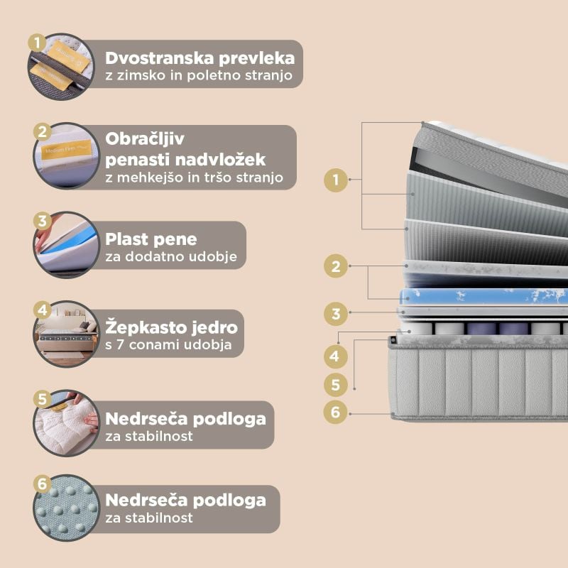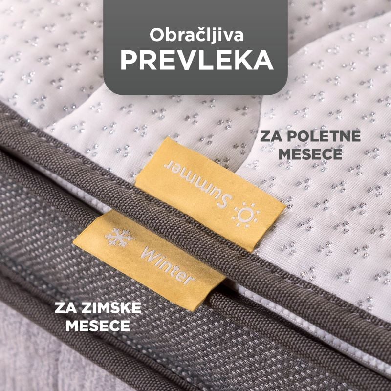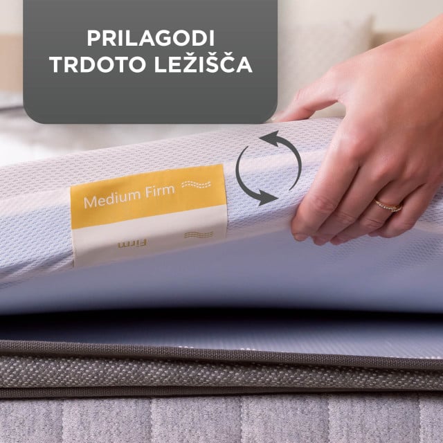 Obračljiv nadvložek je narejen iz dveh plasti pene – mehkejše in trše. Mehkejša spominska pena objame tvoje telo in se odziva na vse premike med spanjem, da ti zagotovi maksimalno udobje. Na drugi strani je trša pena, ki nudi dodatno podporo telesu in ohranja hrbtenico v pravilnem položaju za spanec brez bolečin.